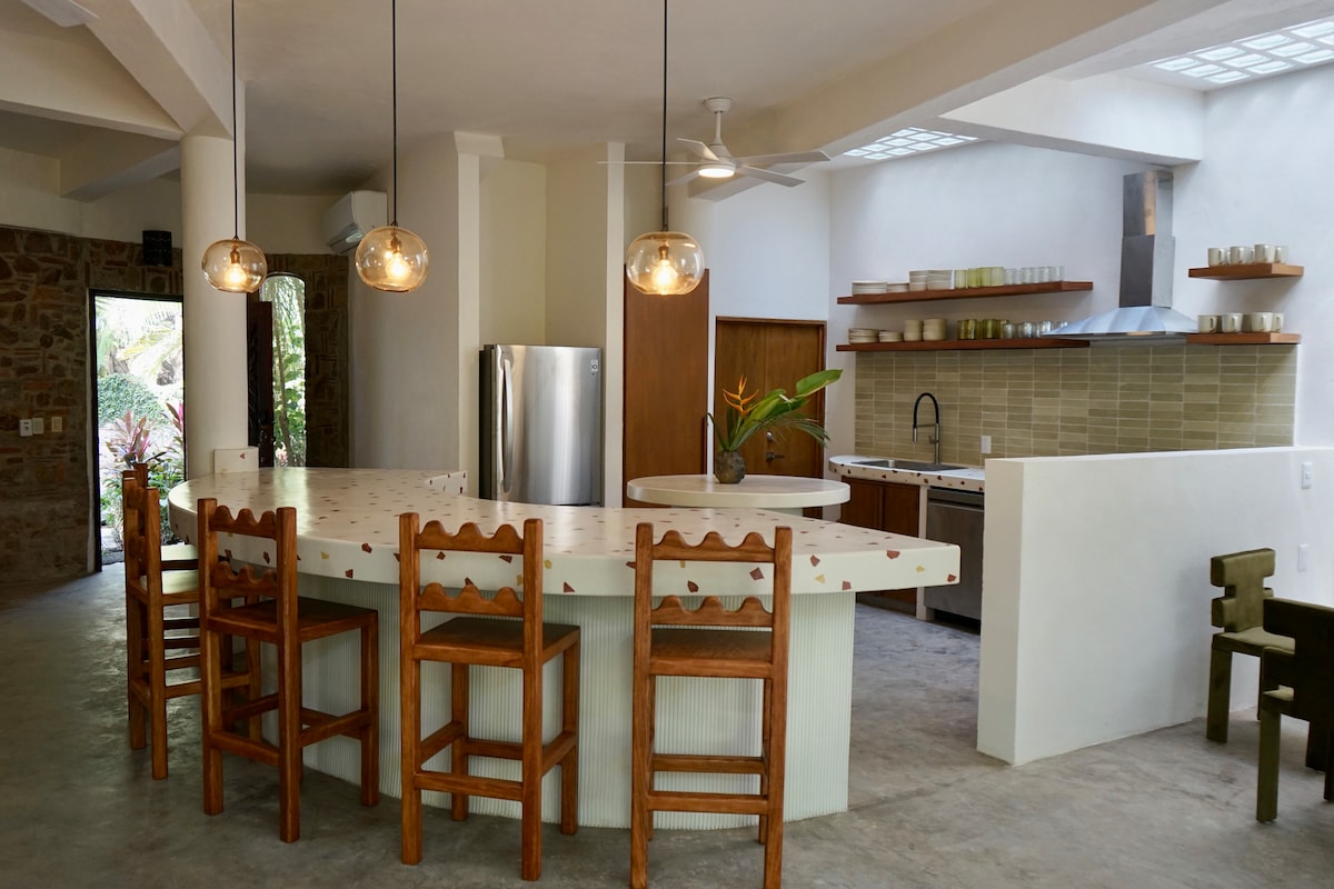 Make unforgettable memories at this unique and family friendly place. This home away from home, has an fully equipped kitchen, 3 bedrooms, 3 bathrooms, with modern air conditioning, 12 ft ceiling with modern fans in each room, a small (cool)dipping pool, rooftop terrace, and a patio with palapas. It's located right on the main street near convenience stores, restaurants, shops, and pharmacies. 10 mins stroll to the beach for breathtaking sunsets and sunrises. Or hit the waves for surfing ride.