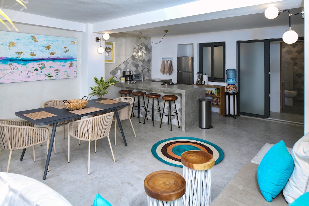 Our 800sq ft beachfront casitas are ideal for a couple, a family of three, or just a couple of friends traveling together. The casitas provide total privacy within the openness of the studio layout. The front of the casitas open up onto the patio through a huge 12-foot wide pair of French doors that bring the ocean view and breeze right into your casita. Please note our Casitas #1-4 all share the same layout & beautiful ocean view. Our gallery is a collection of images from different casitas.