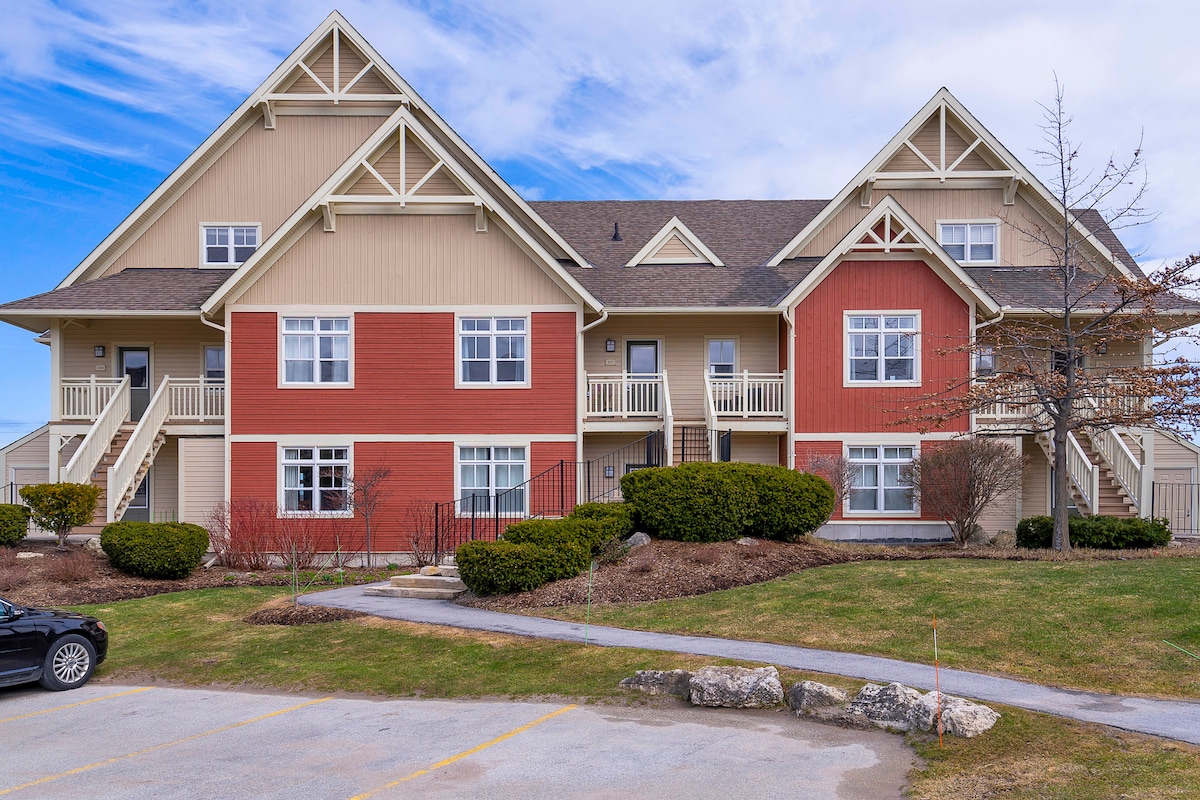 Relax and enjoy the beauty of the Blue Mountains nestled in this gorgeous two bedroom condo located directly across from the Blue Mountain Village in the prestigious Snowbridge community. - 10 minute walk to the Village - located on Monterra Golf Course - private backyard - the pool is shared with the residents of the subdivision (summer only) - BBQ - sleeps 6 comfortably - 5 min to town, stores/ amenities -condo is on the main floor level -pool open for summer only (May to September)