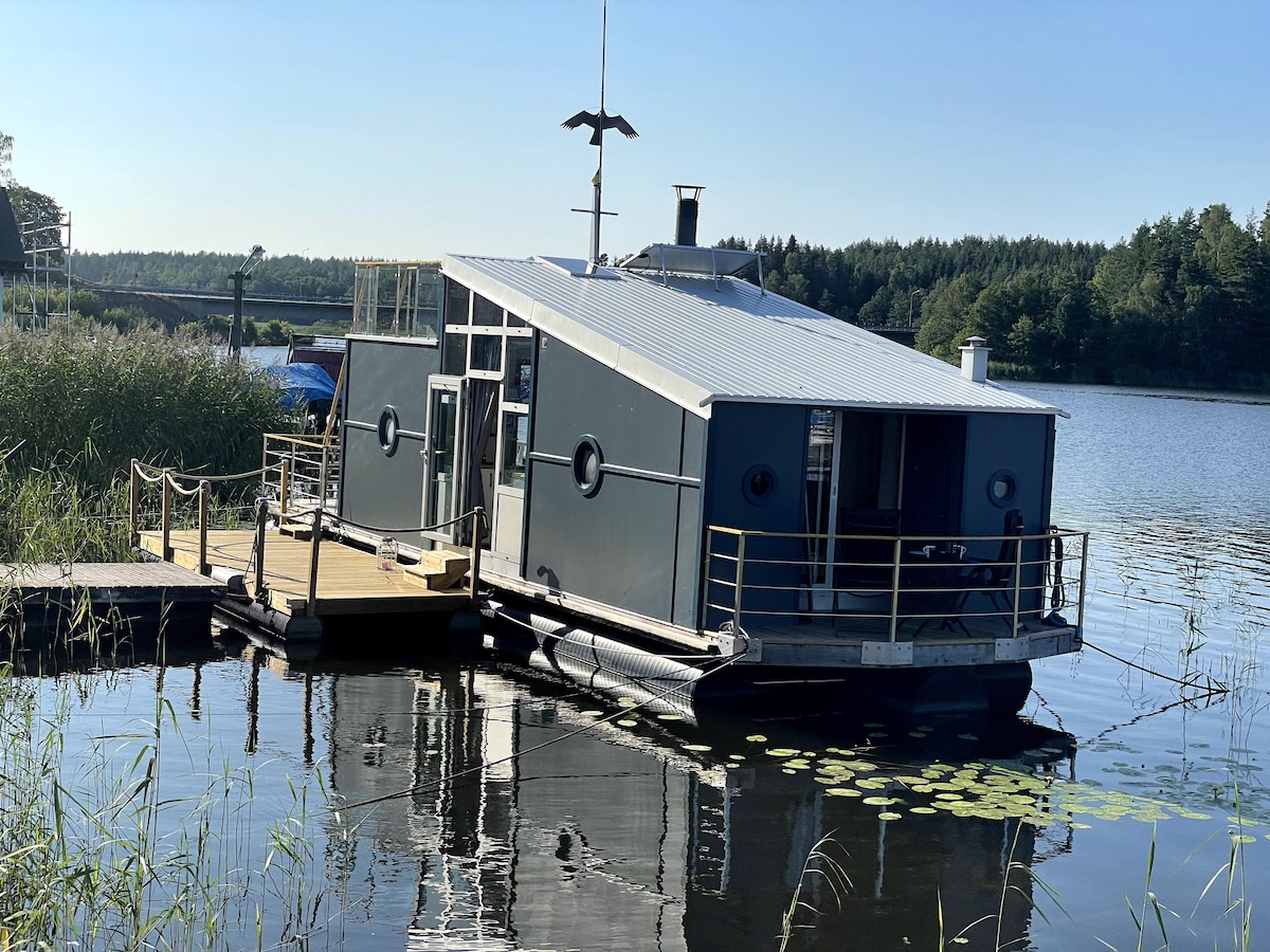 Enjoy 50 m2 houseboat with it’s own sauna and panoramic views of the water. Swim directly from the bedroom. You will have a memorable experience because of the views, the beautiful location, the garden, and the jetty with it’s sundeck. Our boat is suitable for couples who like to surprise or celebrate their partner, adventurers who want to get close to the nature and to still be near Stockholm. A canoe is avalible in summertime. We also offer an add-on spa & wood-heated sauna in eveningtime.