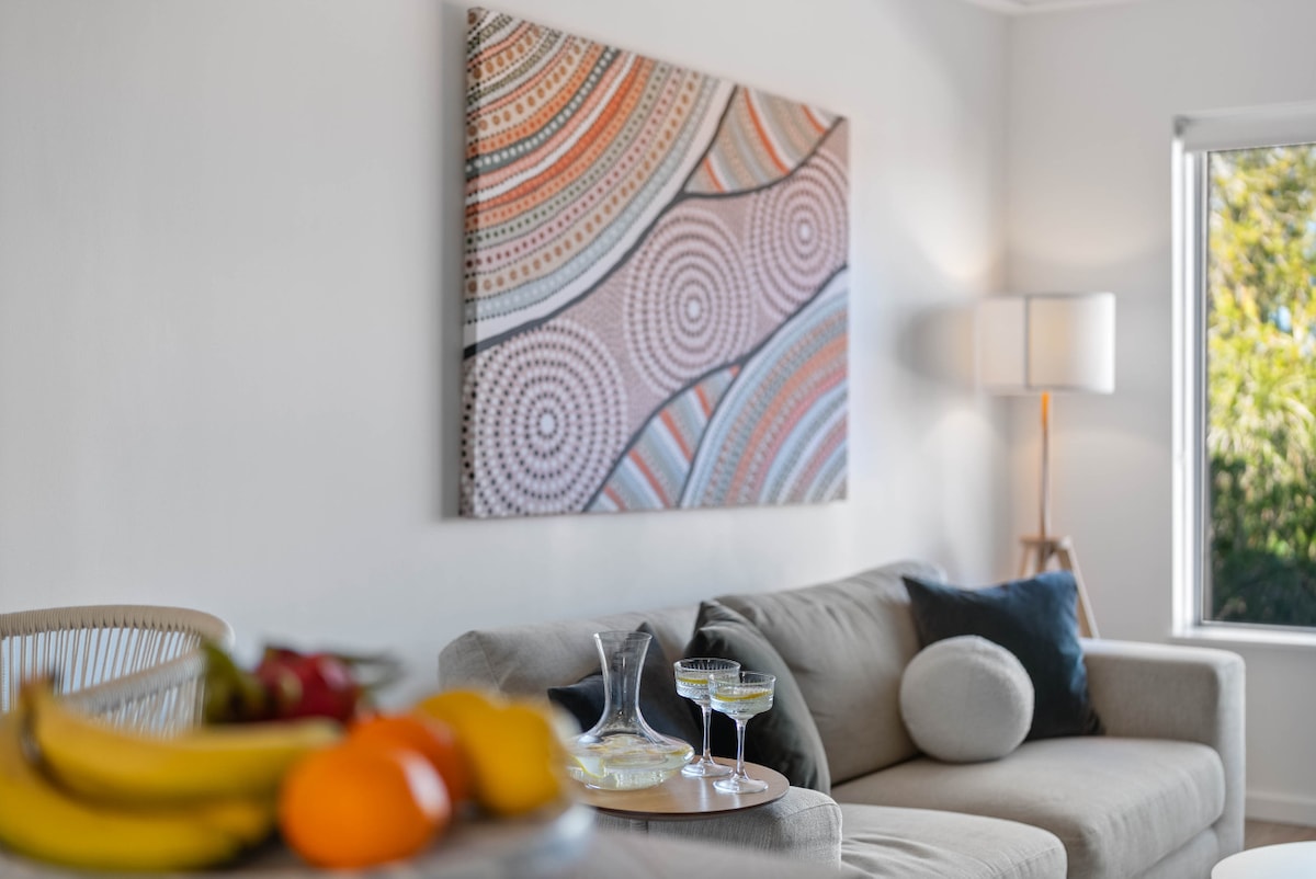 Comfortable queen bed with quality bedding Air conditioning cooling & heating Fully equipped kitchen with microwave, smeg kettle,full size fridge freezer, gas hotplate and oven Flat screen built in wall TV Comfortable 3 seater couch,ottoman and armchair Cute 2 seater dining nook, the perfect spot for that morning coffee while taking in the views of the ocean Renovated bathroom with hairdryer, bath towels, body wash Wifi Top floor NO KIDS