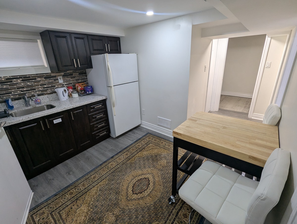 · Snowless Parking, 1 bed 1 bath, 1 living room, with full laundry and kitchen, refrigerator of course! and they are exclusively for your use! · Comfy environment with queen-size bed, cozy vibe, as well as keypad entrance to secure your safety. · Located in a quiet neighborhood. 1 minute to forest park and run field. · Provide 1 parking. 3 mins walk to bus stops. 10 mins drive to Highway 401. · Escape the busy and relax in this your premium highly privacy little basement apartment.