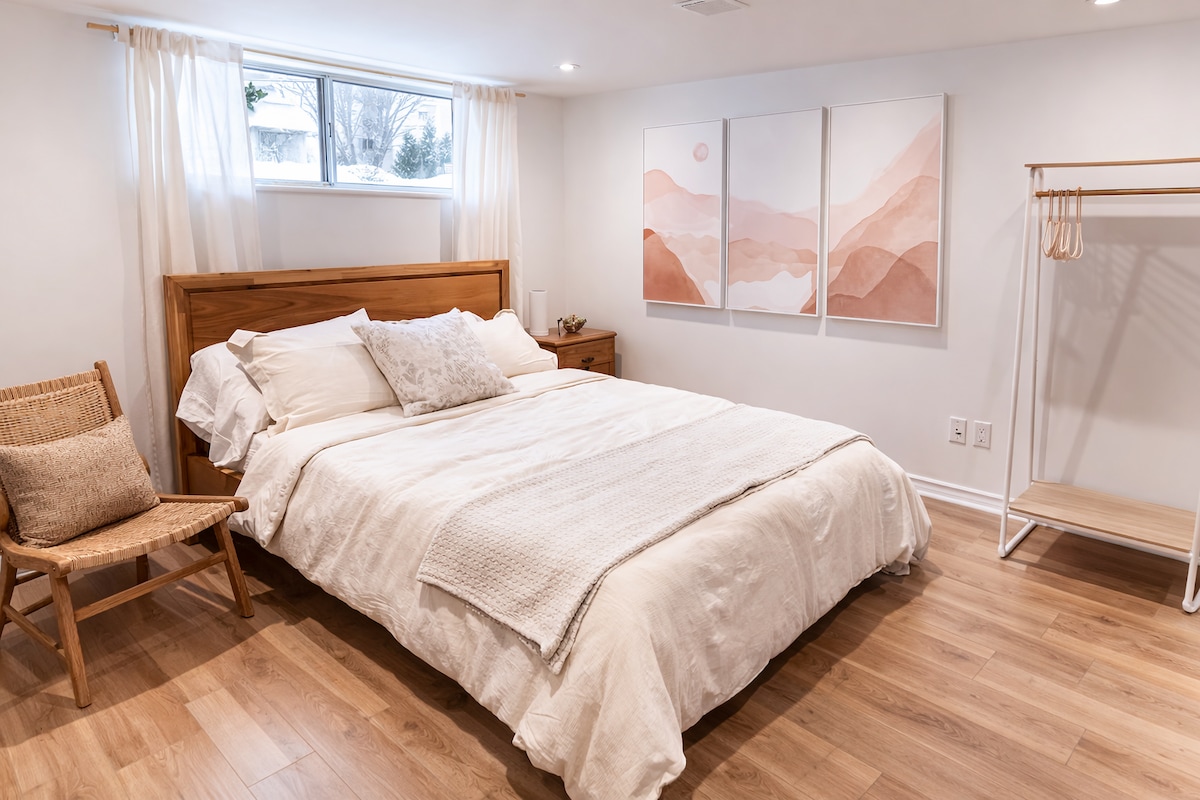 · Snowless Parking, 1 bed 1 bath, 1 living room, with full laundry and kitchen, refrigerator of course! and they are exclusively for your use! · Comfy environment with queen-size bed, cozy vibe, as well as keypad entrance to secure your safety. · Located in a quiet neighborhood. 1 minute to forest park and run field. · Provide 1 parking. 3 mins walk to bus stops. 10 mins drive to Highway 401. · Escape the busy and relax in this your premium highly privacy little basement apartment.