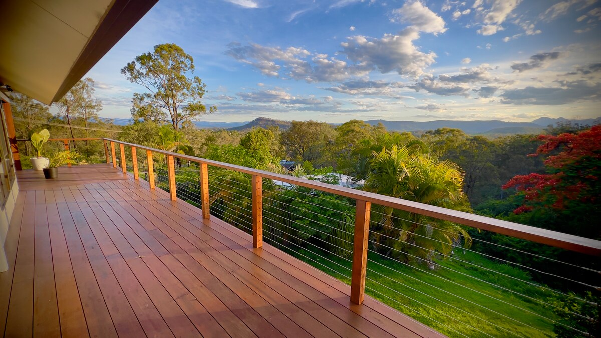 Beautifully renovated historic Queenslander, situated on top of Mt Tamborine with spectacular views over the Great Dividing Range. This 4 Bedroom house is mountain living at its best. 2 large decks with views that come to life at sunset and a swimming pool with same views. Air-conditioned for summer, log fire for winter... always a comfortable place to be. View video ‘find the perfect place’ on YouTube There is a $150 fee for pets. NO EVENTS UNLESS APPROVED BY HOSTS