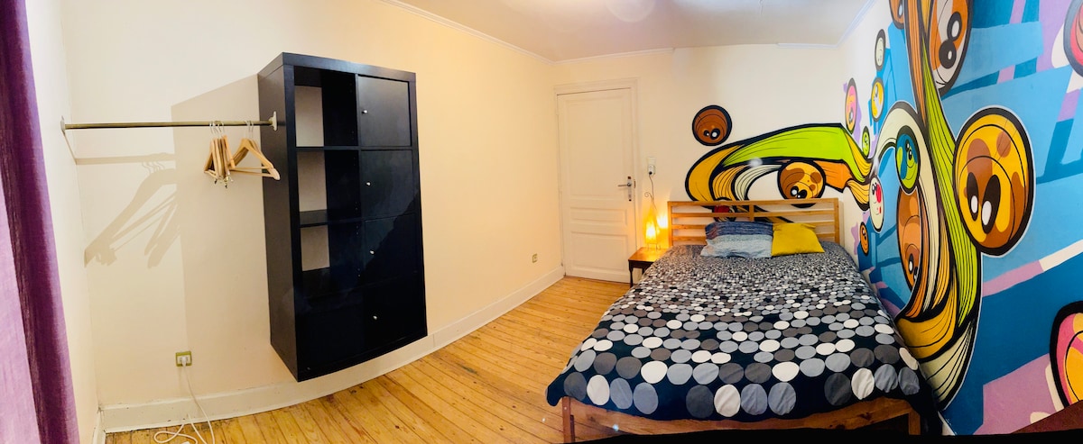 Welcome in the downtown loft with a snooker and a balnéo bathtub. 2 bedrooms . 1 has a skyline view Very cosy and close to city center Nice big terrasse with a BBQ The subway is next to the house. Access to a free Private parking which is secure 24h 1 inconvenience 4 floor without lift :/ For info bedroom 1 is located at end of terrasse Bedroom 2 is upstairs with a nice Skyline view The house is fully equiped and private for max 4 guests no party allowed , or extra guests !!!