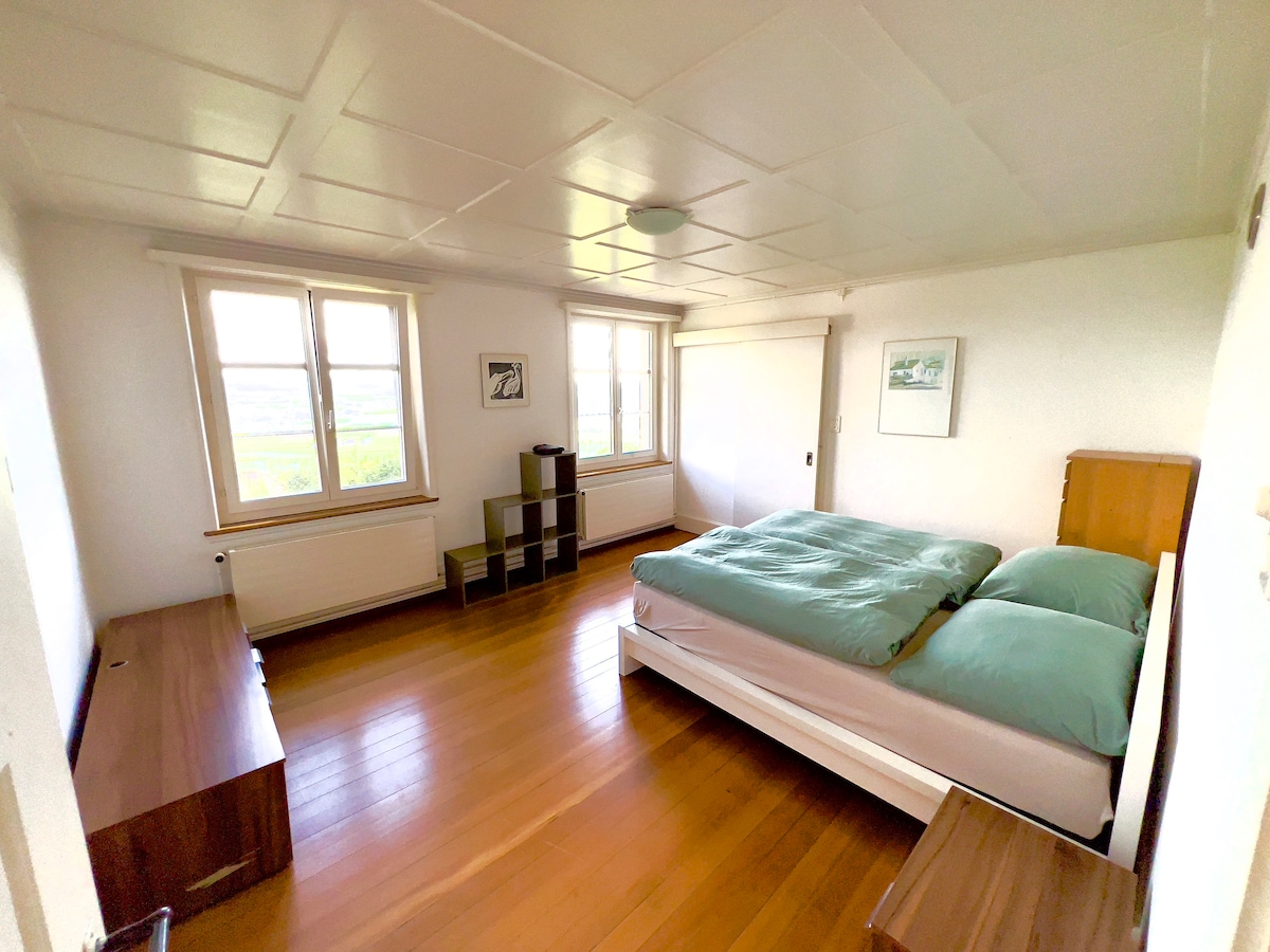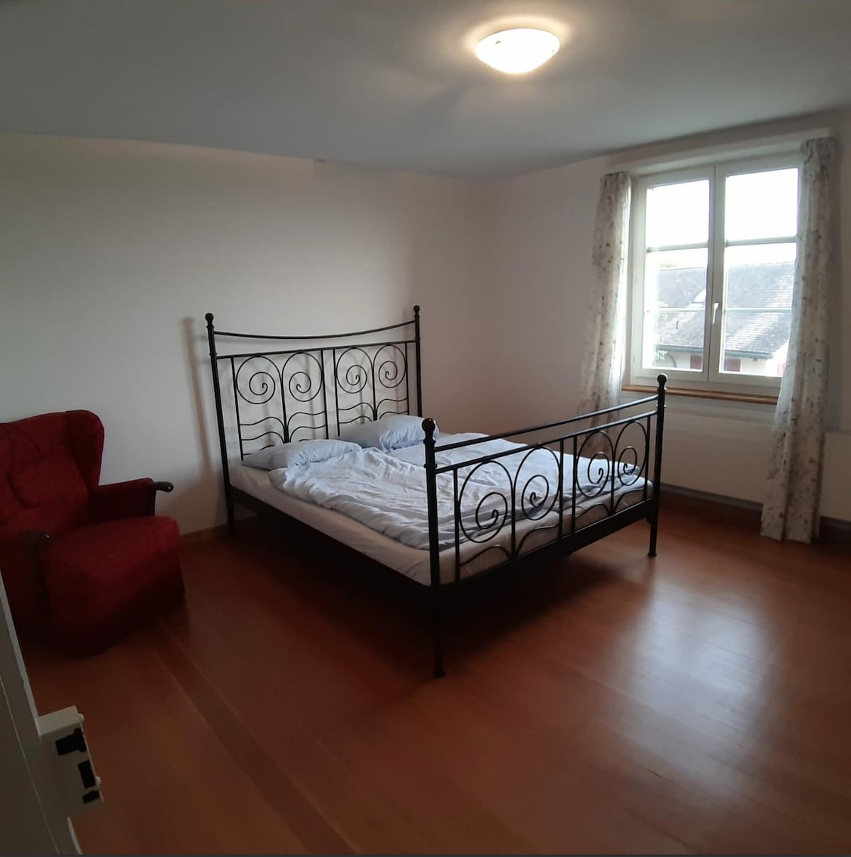 A welcoming double room inside a charming 4-bedroom guesthouse, Two beds combined as a double bed Large sunny windows with a beautiful view Two night tables and storage space for clothes The shared bathroom features both a bathtub and a shower for your comfort. located just above the Aussicht Iselisberg Restaurant, where Jordi family delights guests with seasonal and local cuisine that turns every meal a sensory journey. Perfect for travelers seeking relaxation and authentic local experiences.