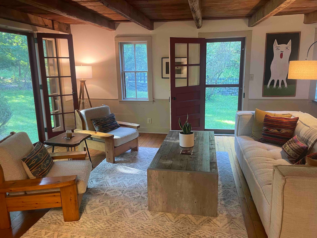 Blue Cabin is a cozy, design-forward retreat between the Capital Region and the Berkshires. Enjoy vaulted wood ceilings, a forest-green kitchen, and a spa-style bath. Outside, unwind in the covered lounge with U-shaped sectional, charcoal grill, and TV—or explore the backyard, where a creek runs through and a seasonal flower garden blooms. Peaceful, private, and perfectly located for both rest and adventure.