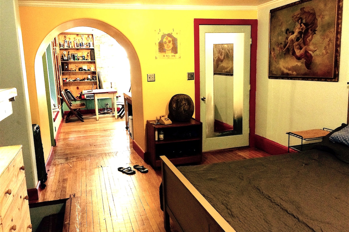 Comfy, oddball studio that preserves the pre-gentrified bohemian feeling of Troy circa 2005. Lovingly constructed by mysterious artisan Oswaldo who stayed in November 2005 and then disappeared, leaving this gem as part of his local legacy. In the heart of downtown Troy, two doors from TAKK house, sharing the alley with Peck's, blocks from Saturday farmers market, walking distance from RPI. This unit is private but the large kitchen and laundry (green floor) is occasionally accessed by hosts.
