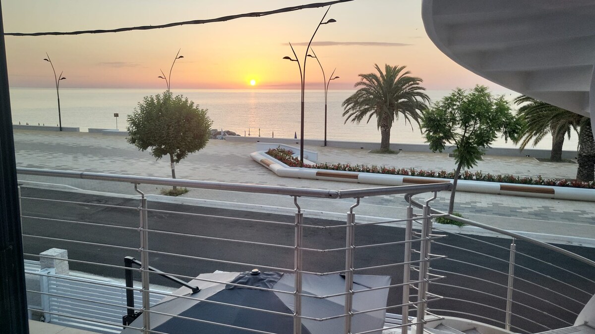 Splendido appartamento con terrazzino SUL MARE ristrutturato nel 2021 Aria condizionata e pompa di calore cucina ad induzione Soluzione adatta alle famigli la posizione sul mare e sugli stabilimenti balneari,lungomare tranquillo di giorno con ampie spiagge di sabbia ed un mare basso e pulito; la sera offre un panorama ricco di colori e folclore e un lungomare animato da bar, ristoranti e giochi, A 3 minuti a piedi si raggiunge il centro del paese e la fermata bus provenienti dal Nord Italia.