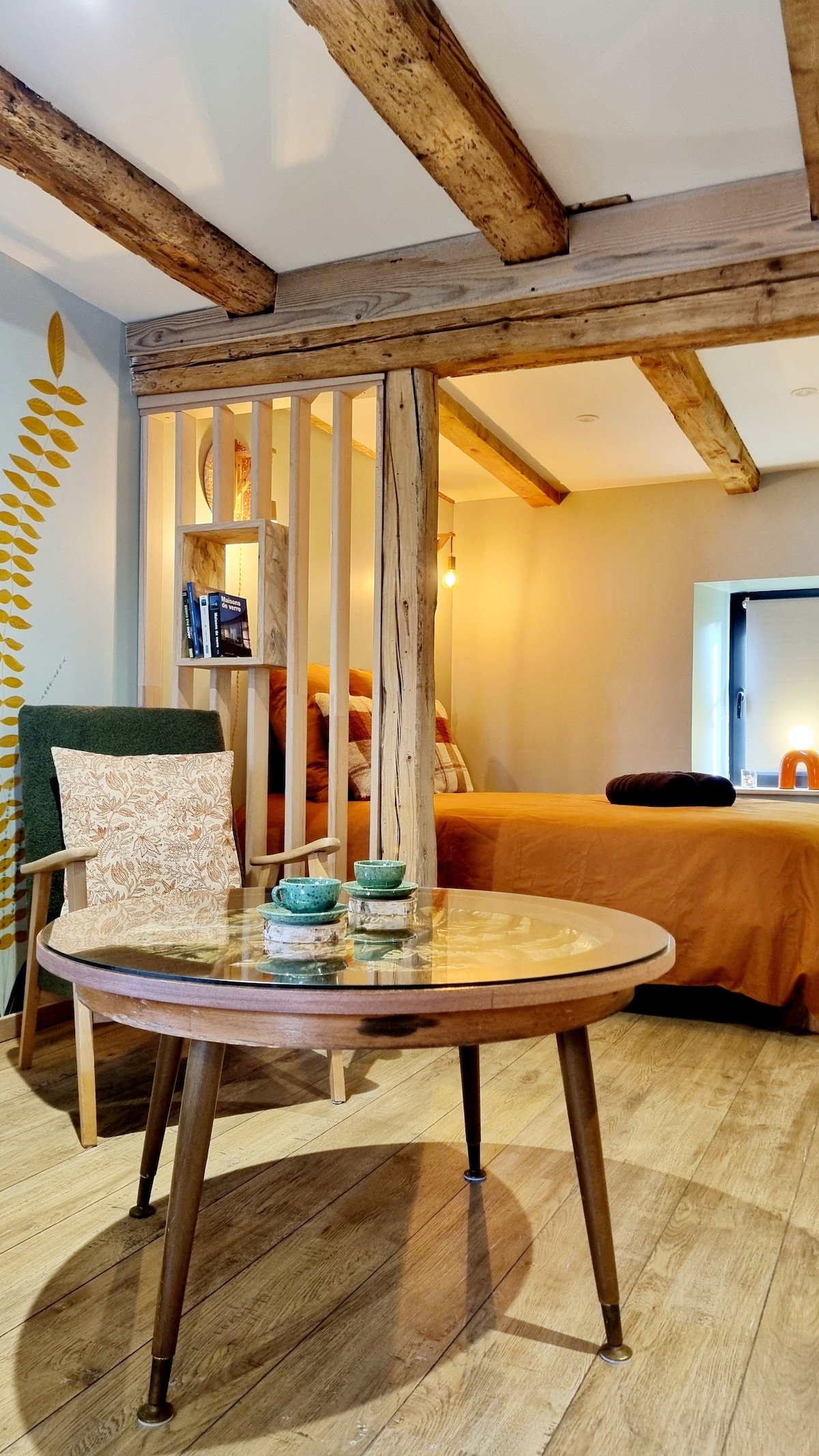 Mon gite est neuf, disposant d'une mezzanine hauteur 1m60 maximum avec un lit double, il est idéal pour deux personnes, la salle de bain est équipée d'une douche à l'italienne avec wc. La cuisine est équipée d'une machine à café Nespresso, bouilloire,un four, micro onde et un frigo et lave linge. Notre habitation dispose aussi de la climatisation. Vous disposerez aussi d'un espace salon avec télévision. A l'extérieur un salon de jardin et barbecue est à votre disposition sous une pergola.