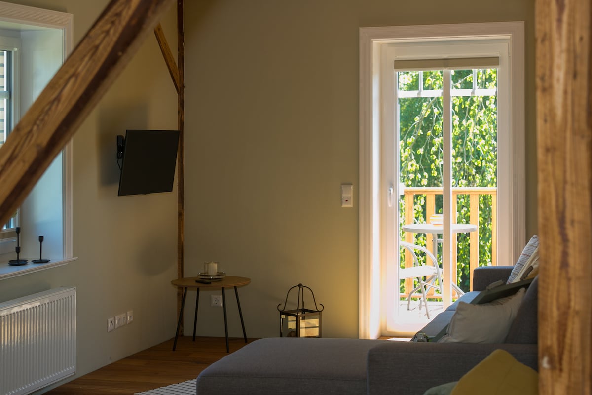 Our "Liese" for 2-3 persons is Nordic clear, bright and open. From 2021 to 2022, the basement of the house was comprehensively core renovated and provided with a tidy interior. The approx. 60sqm apartment includes a large integrated living and kitchen area, a spacious bedroom and a modern bathroom with rain shower. The rear exit of the house leads into the garden - it extends directly to the Schlei and has its own jetty with bathing facilities.