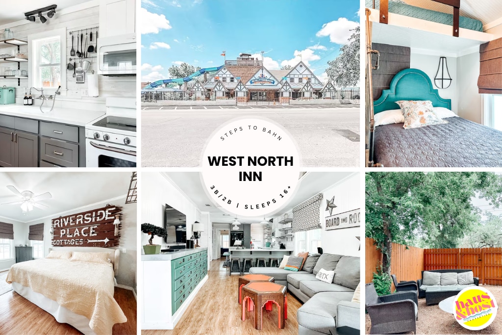 Directly adjacent to Schlitterbahn Waterpark -- so close that you can go home for lunch! Located in the heart of New Braunfels this unique home is affectionately nicknamed the West North Inn. Walk 60 steps from your front door to endless Schlitterbahn or river floating fun! Beautifully renovated, this upscale comfort, magnolia style charm home sleeps up to 20 guests. Comfy bedrooms, an inviting living area, a backyard with a playscape and an outdoor fire pit make this home perfect for groups.