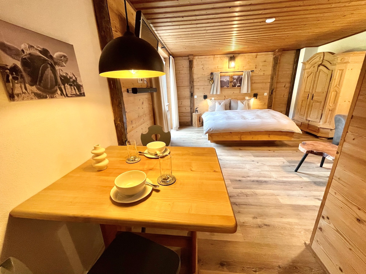 Nestled amidst the breathtaking mountain scenery of the Allgäu region, in the picturesque, winding village of Hinterstein, lies a charming and cozy one-room holiday apartment in a traditional Alpine house. Reclaimed wood elements, furs, slate, branches, and floral arrangements come together here, and no detail has been overlooked with loving attention to detail ♥.