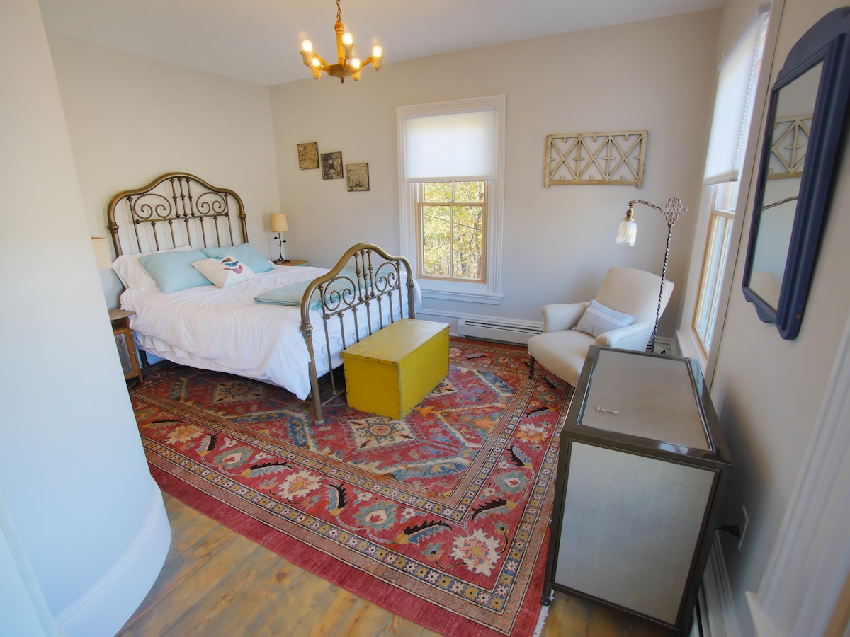 Fully furnished, private bedroom with queen bed and private bathroom in the lovely 1830 Beekman House located in the Historic District of Middleburgh, New York. Reservation also includes exclusive and private access to one of the downstairs parlors where you will find breakfast each morning prepared personally for you. (Assigned parlor pictured in photos). Amenities include parking, WIFI service, Smart TV with access to Netflix, and accesses to the 3 acres grounds.