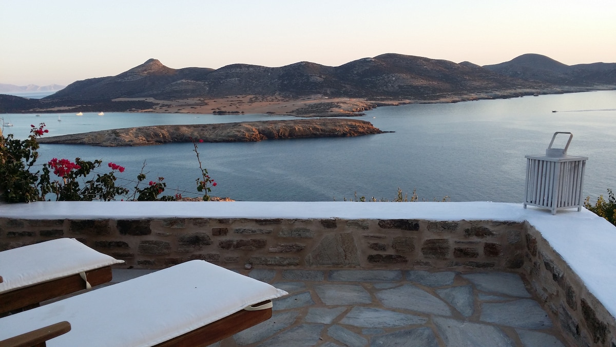 A private villa with panoramic views to the sea and sunset, and the town of Parikia. The house offers full privacy & comfort it's been recently refurbished and it is fully equipped. Surrounded by garden and terraces & a lovely porch with dining/lounge areas, so you can enjoy outdoor living. Located at a beautiful location on a hill 1km from Parikia center. 2 bedrooms, kitchen, dining area, lounge, working office area. Safe for kids. *Special offer for September, October, November - contact us!