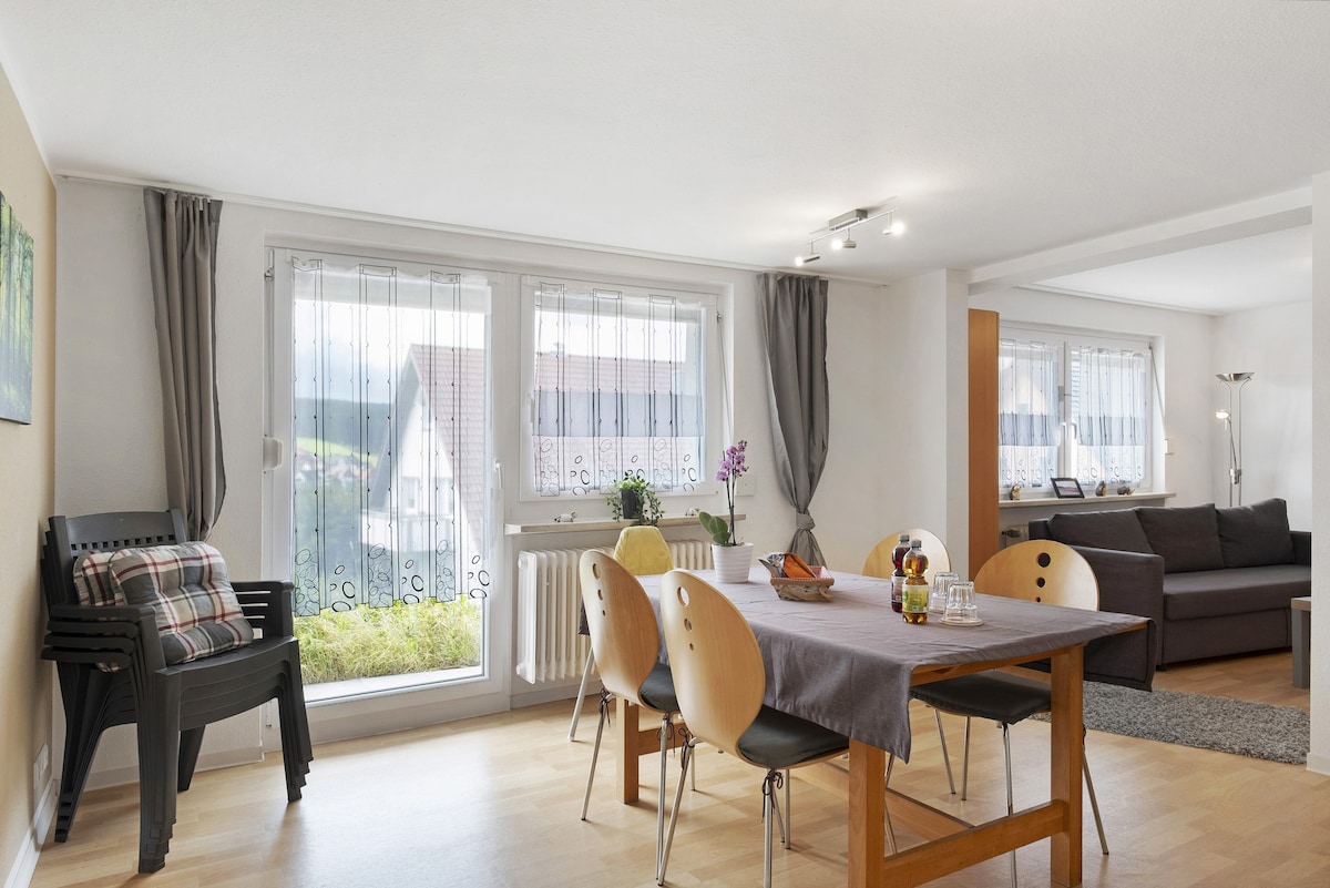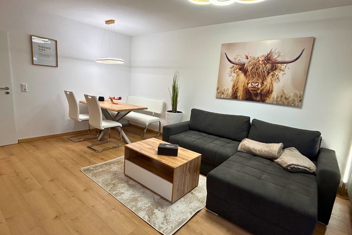 Discover the Black Forest from our charming maisonette-flat, a fusion of rustic charm and modern comfort that offers everything for short and long stays. → Free sauna and gym → Large garden with fire pit & pond → Comfortable king-size beds → Sofa bed for 5th & 6th guest → Wood-burning fireplace → Large kitchen island → Rain shower → Hiking highlights & supermarket within walking distance ☆ "The accommodation and the hosts, both unbeatable. The best we've ever rented to date."