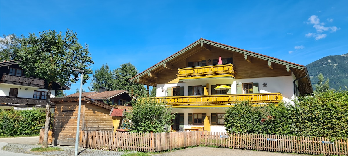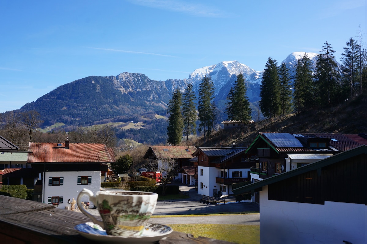 Renoviertes Appartement (ca 35 qm) im natürlichen Stil. Tolle zentrale, trotzdem ruhige Lage. Spaziere zum Königssee & genieße den tollen Bergblick. Einkaufsmöglichkeit, Bäcker, Freibad, Restaurants und Cafés sowie Bushaltestelle in unmittelbarer Nähe. Completely renovated apartment (approx. 35 sqm) in central village. Calm & cozy! Connection to busses, stores, swimmingpool, cafés and restaurants nearby. Take a walk to lake Königssee & enjoy beautiful mountain views.