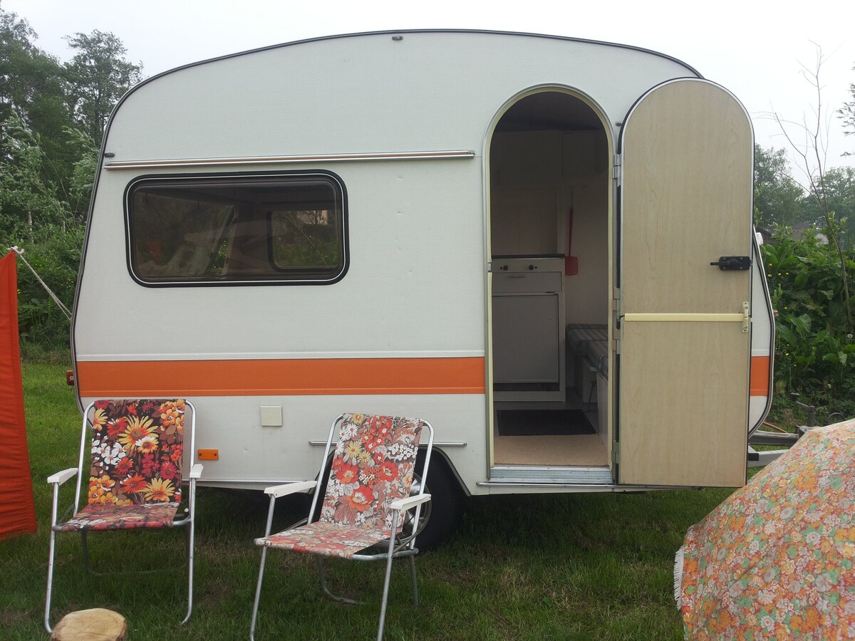 Deze unieke en romantische accommodatie valt ongetwijfeld in de smaak. Slow living op een rustig plekje op boerderijcamping de boergondier (door de anwb genomineerd als beste kleine camping 2023) Veel groen en privacy op de kampeerplaats en tijd voor elkaar, rummikub en de mens erger je niet staan voor je klaar. Waan je terug in de 70 jaren met de karakteristieke kleuren oranje en bruin tinten. Maak gebruik van het sanitairgebouw op de camping of huur een prive sanitair naast je caravan.