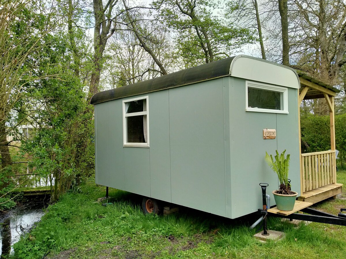 Aan de rand van een kleinschalige natuurcamping staat pipowagen Loeloe met een prachtig uitzicht over water en landerijen Hoor de vogelgeluiden en kijk naar de herten, paarden of schapen die op het land staan. Romantisch ingericht met een overkapt terras zodat je ook met minder mooi weer buiten kunt zitten. De wagen heeft een keuken met koelkast, gasfornuis. en electrische verwarming. Toilet en douche is in het kleine toiletgebouw dichtbij. Douchen is met een muntje van 0,50 voor warm water.