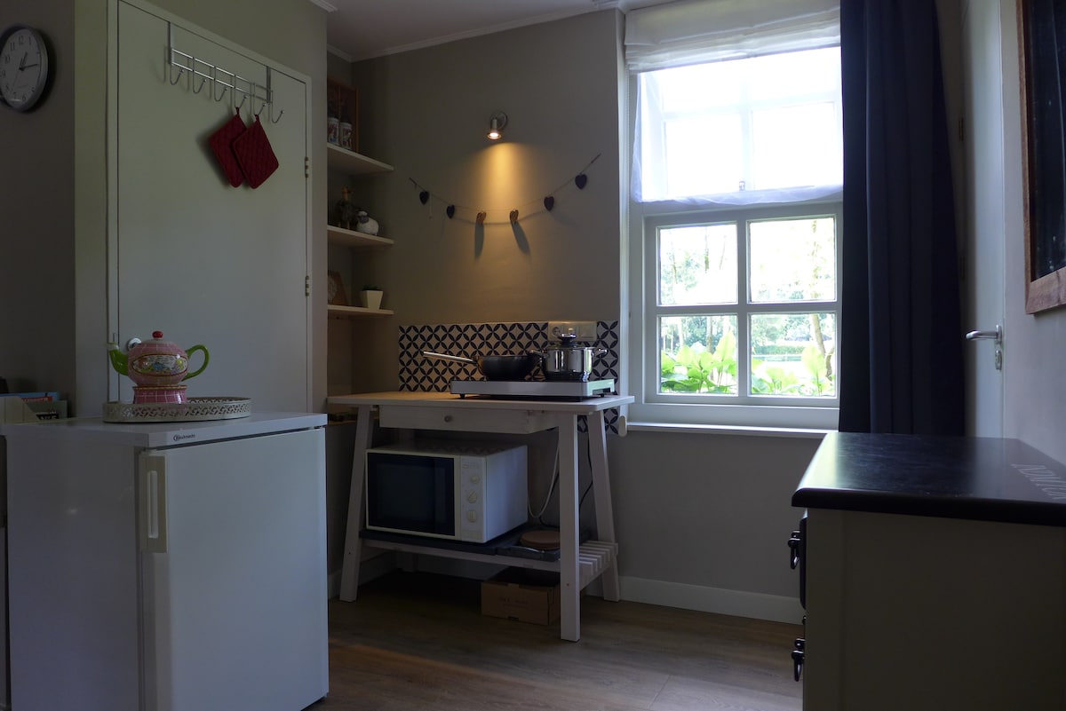 Het Voorhuis van onze rijksmonumentale boerderij is gerenoveerd tot een volledig luxe suite met eigen voorzieningen. De originele details, zoals de hoge plafonds, de bedstee wanden en zelfs een originele bedstee waar je in kan slapen, zijn behouden. Maar liefst 65m2 met een eigen keuken, ruime woonkamer en aparte slaapkamer met vrijstaand bad. Toilet en ruime inloopdouche. Met de optie om, tegen extra kosten, gebruik te maken van de hottub, sauna en buitendouche kom je heerlijk tot rust