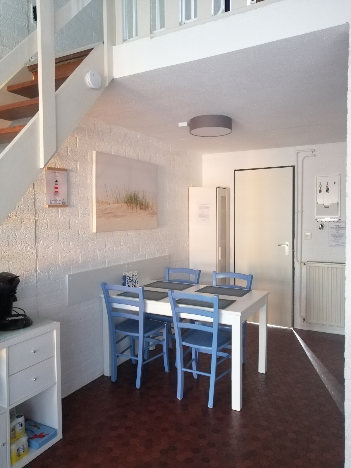 Galerie-Wohnung mit Wohnzimmer mit Esstisch und Sofaecke, ein Duschbad , Küche mit Gasherd, Mikrowelle und Spülmaschine 1. Schlafzimmer oben mit 2 Einzelbetten sowie ein kleines Waschbecken in der oberen Etage, Kinderreisebett vorhanden. Unten 2. Schlafzimmer mit einem Boxspringbett 140x200 cm. Ab 01.10.2023 inkl. Bettwäsche, Handtücher bitte mitbringen Die Terrasse ist nicht einsehbar und eingezäunt. Sie ist ausgestattet mit einem gemauerten Grill und Essplatz. Haustier erlaubt