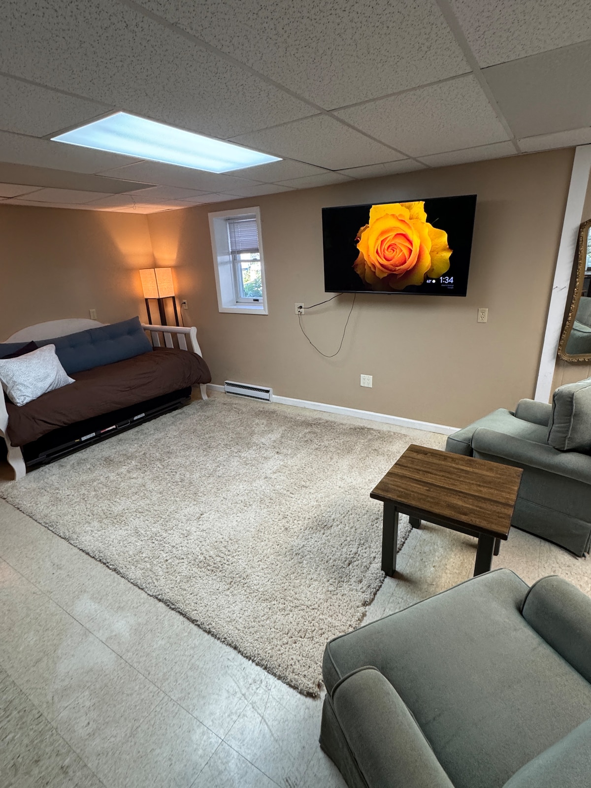 Updated studio in the heart of Finger Lakes Wine Country, with one-of-a-kind views of Seneca Lake and vineyards from a gorgeous lawn. Modern farmhouse inspired decor, luxury linens, an adorable kitchenette, this is the perfect stay for visitors looking to explore the Finger lakes. Take advantage of our fire pit, hike through the vineyards down to our beautiful creek, or drive down the hill for direct lake access in Smith Park. Room is very spacious for 2 but works for 4 with a pull out sofa.