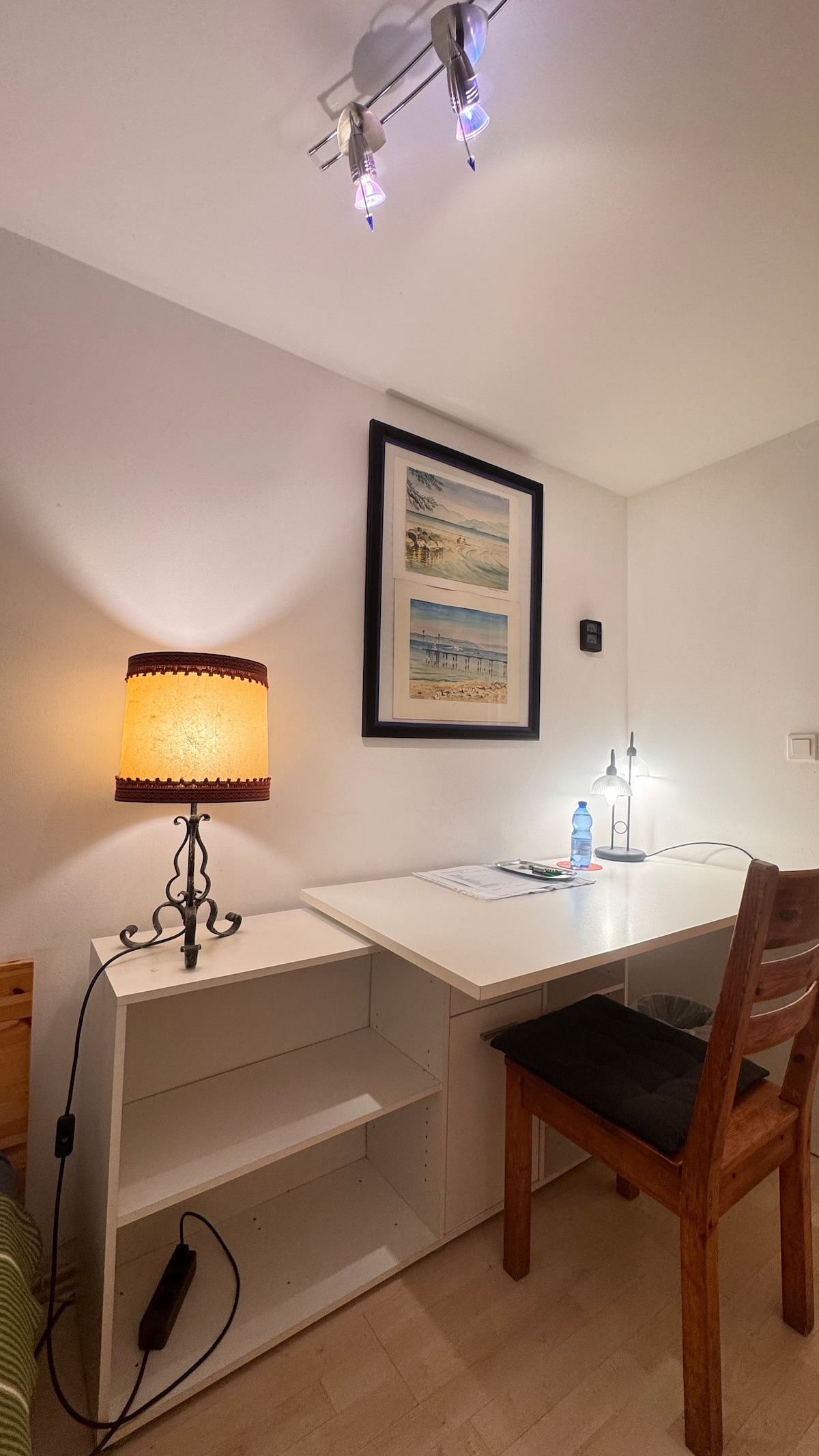 Das 16 Quadratmeter große Zimmer mit Bad ist in Haidhausen, einem belebten, kreativen Viertel im Münchner Zentrum. Wenige Meter entfernt sind Supermärkte, Bars und Restaurants. Du bist im EG mit separatem Eingang. Beim Betreten des Zimmers siehst du vor dir das helle Bad mit Dusche und WC, und eine Ecke mit Geschirr, Wasserkocher und Kühlschrank. Das Studio hat keine Küche. Links dann hohe Decken, ein hochwertiger Holzboden und grosse Fenster, dazu ein Schreibtisch und ein neues, richtiges Bett.