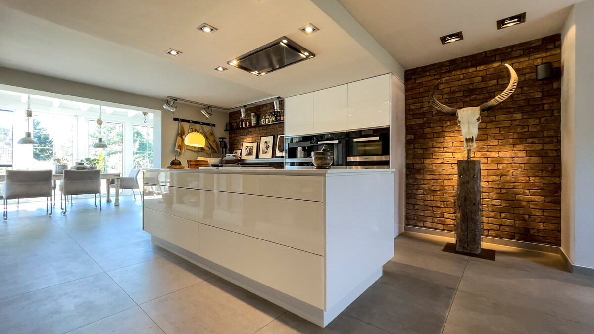 Der „Heuboden“ ist mit 120 m² Wohnraum besonders großzügig gestaltet und bietet mit dem eigenen Wellnessbereich einen Hauch von Luxus. Nach dem Saunagang kann man bei einem Bad zu Musik entspannen. Fitnessliebhaber finden ein WaterRower Rudergerät vor. Für multimediale Unterhaltung ist mit hochwertigen OLED TV sowie einem Plattenspieler samt Vinylsammlung gesorgt. Liebevolle Details laden zum Entdecken ein. Direkt am Dorfbach gelegen kann man bei uns verweilen und entspannen.