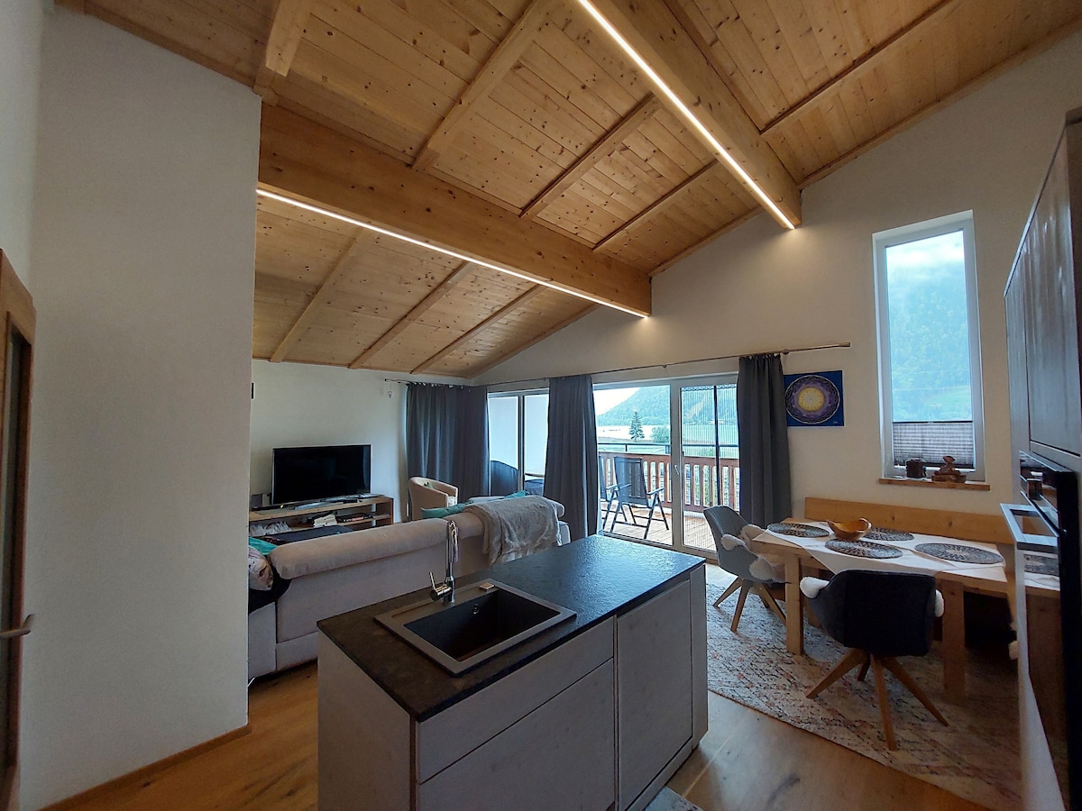 Situated on the outskirts of a Tyrolian mountain village this place offers you a wonderful-broad view. The apartment, lovingly combining tradition and modernity will let you calm down and recharge your batteries instantly. A closeby cable car enables you to all kinds of mountain sports in summer and winter. Yet- even those, who just "stay and relax" will feel at home. WIFI, TV, BT-boxes, parking space are available free of charge; for the Sauna we take a small feey. Kitchen is well equipped .