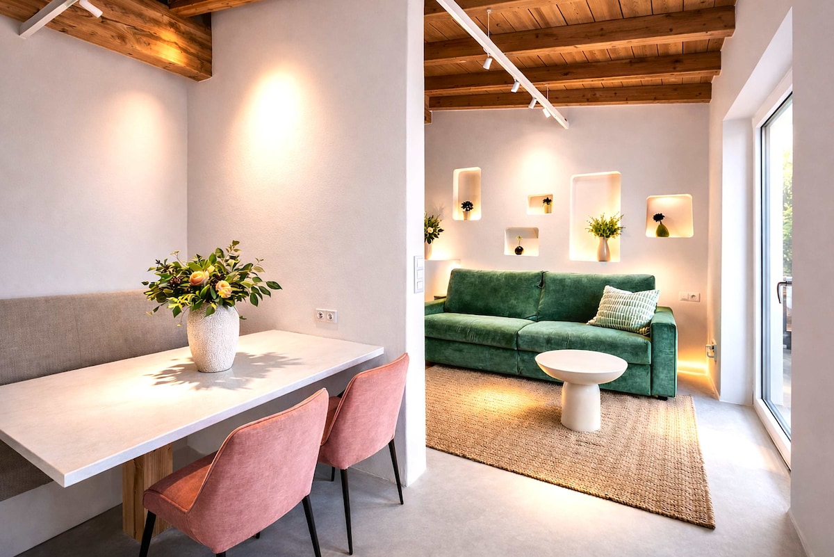 The Suite category offers a spacious 56 m² apartment for up to four people. It features a bedroom with a king-size bed and a living and dining area with a double sofa bed. The fully equipped kitchen with a seating area, a luxurious bathroom with a shower, a private washer-dryer, and a modern infrared cabin offer the utmost in comfort. Enjoy a hearty breakfast or a relaxed dinner on the cozy terrace.