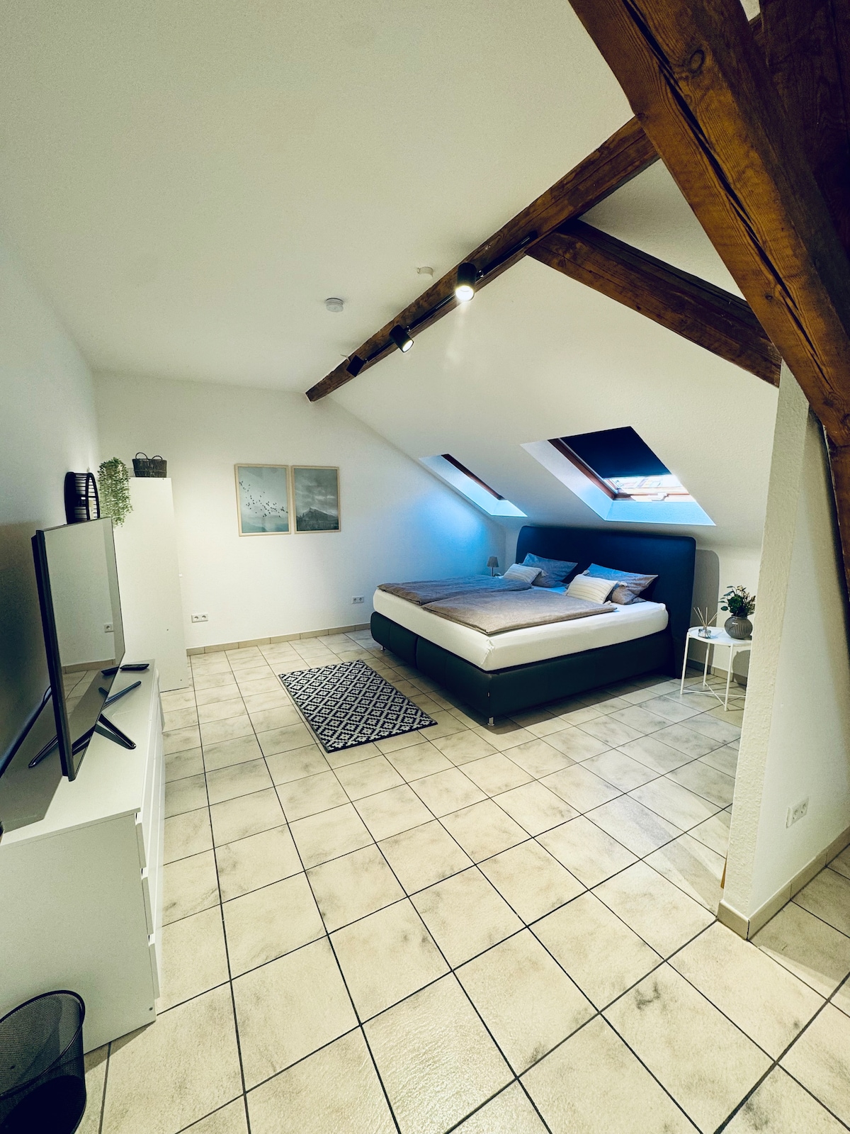 Das Apartment befindet sich in der 4 Etage eines Altbaus aus dem Jahr 1909 mit Blick auf die Dächer der Schweinfurter Altstadt. In dieser 40m² großen Dachwohnung mit ausgebautem Giebel und freiem Ausblick fühlt man sich sofort wie Zuhause. Es verfügt über alles was es für einen längeren Aufenthalt oder für Wohnen auf Zeit nötig ist. Es verfügt über ein Bad mit Dusche und eine brandneue voll ausgestattete, offene Küche mit Kühlschrank, Kaffeemaschine, Toaster, Wasserkocher, Herd und Geschirr.