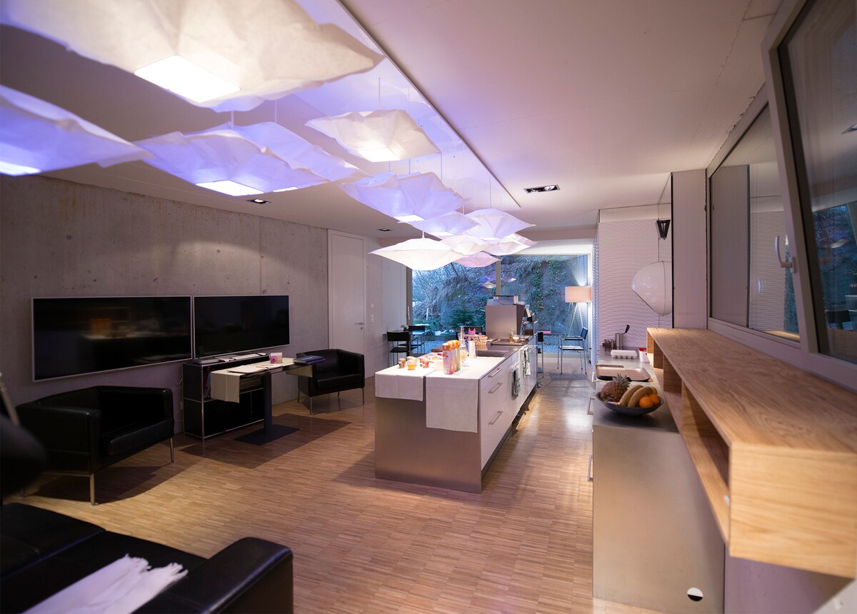 before booking: check number of guests: basicprice for 1 person 32m2 apartment 45m2 roof terrace 1 double bed on wheels 1 extra long bed 3.3m for 1 person or 2 kids 55“ tv huge wooden bath tub (for up to 6 people…!) in your room for private use free wifi / breakfast buffet / parking / singing birds separate part of roof terrace for your exclusive use (optical divider under construction). because breakfast is served on the terrace, absolute tranquillity cannot be guaranteed!