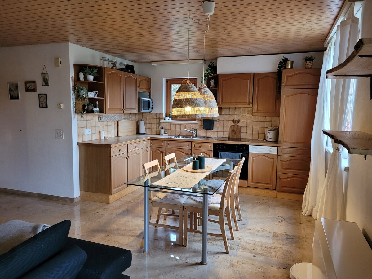 Gemütliches Landhaus mit schöner Aussicht; freistehend; im Grünen; 1.5 km vom Dorf; 30 Auto-Minuten bis zur Stadt, mitten im Wandergebiet. Grosse Spielwiese, Aussichtsterasse (Pergola), Feuerring / Grill. Im Haus ist eine selbständige 2 Zimmer-Einlegerwohnung mit separatem Zugang. Die Zufahrtsstrasse zum Haus ist eine schmale Privatstrasse mit Ausweichbuchten. Winter: bei Schnee ist ein 4WD erforderlich! Leider keine Haustiere möglich, da ich starker Allergiker bin.