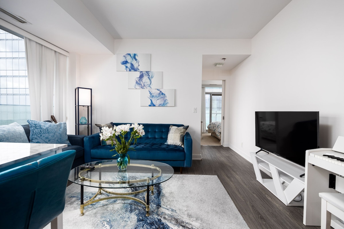 Marvel at the glorious Toronto urban vibes from your room with floor to ceiling panoramic windows. This 1 bedroom condo is professionally designed with modern finishes. You will absolutely love the space we have prepared for you. Relax, unwin,d and enjoy the city views on the private balcony with outdoor furniture. Professionally cleaned after each guest checkout. 100% private and unshared, entire modern condominium unit. Safe, secure, and easy self-check-in procedures with 24/7 security.