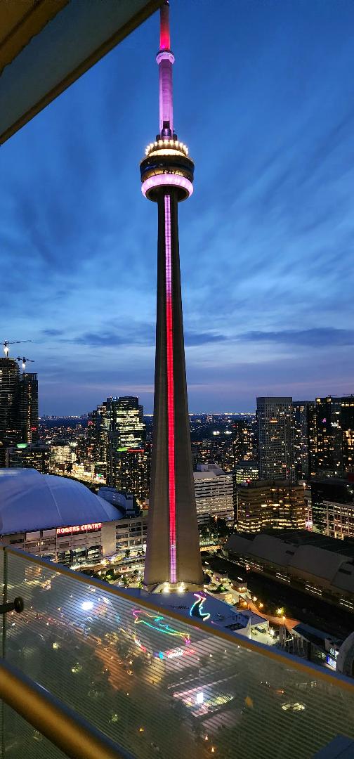 Includes 1 free parking spot! Private 1 bedroom + den condo on a high floor overlooking Toronto with a large balcony, fits 3 guests with 1 queen bed, 1 single cot, and 1 regular sofa. Located next to the CN Tower in the heart of the city. 5 min walk from Scotiabank Arena, Ripley's Aquarium, CN Tower, & the Toronto Harbourfront. Steps from the city's transit hub Union station. Equipped with a kitchen, 4K TV with streaming apps, you will find yourself feeling at home with this luxurious condo.