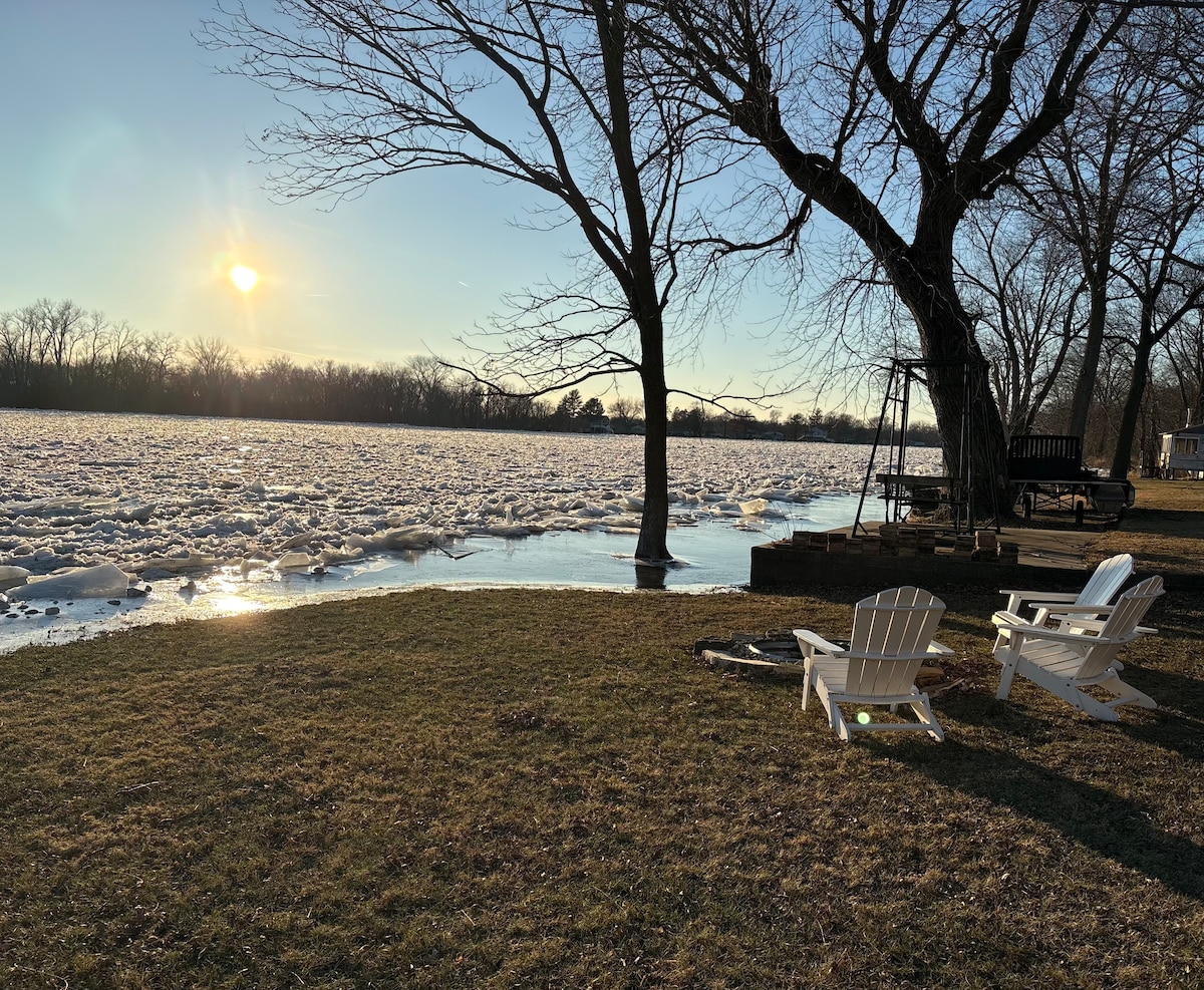 Firepit ready for relaxing nights by the river. Kayaks included for warm days Wake up to sweeping Rock River views, sip coffee on the wrap-around deck, paddle out in the kayaks, and end your evening by the firepit as the sky glows at sunset. This eclectic riverfront bungalow blends vibrant décor with cozy comfort and seamless indoor-outdoor living. Perfect for girls’ weekends, fishing trips, romantic escapes, or peaceful fall getaways — just steps from the water and minutes to shops and dining