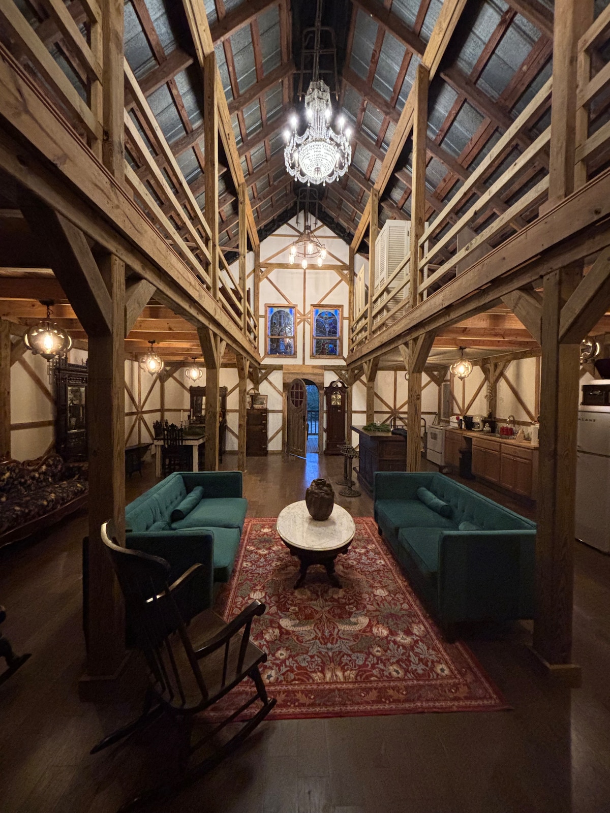 Step into history at Idom Barn, a restored 1910 barn on the original 1847 Pinkston Plantation. Original roof beams, a working hay hoist with chandeliers, stained glass from 19th-century churches, and a hand-carved cedar bed tell the story of generations past. Salvaged doors, antique fixtures, and original farm tools create a one-of-a-kind Mississippi stay full of charm, character, and timeless Southern history.
