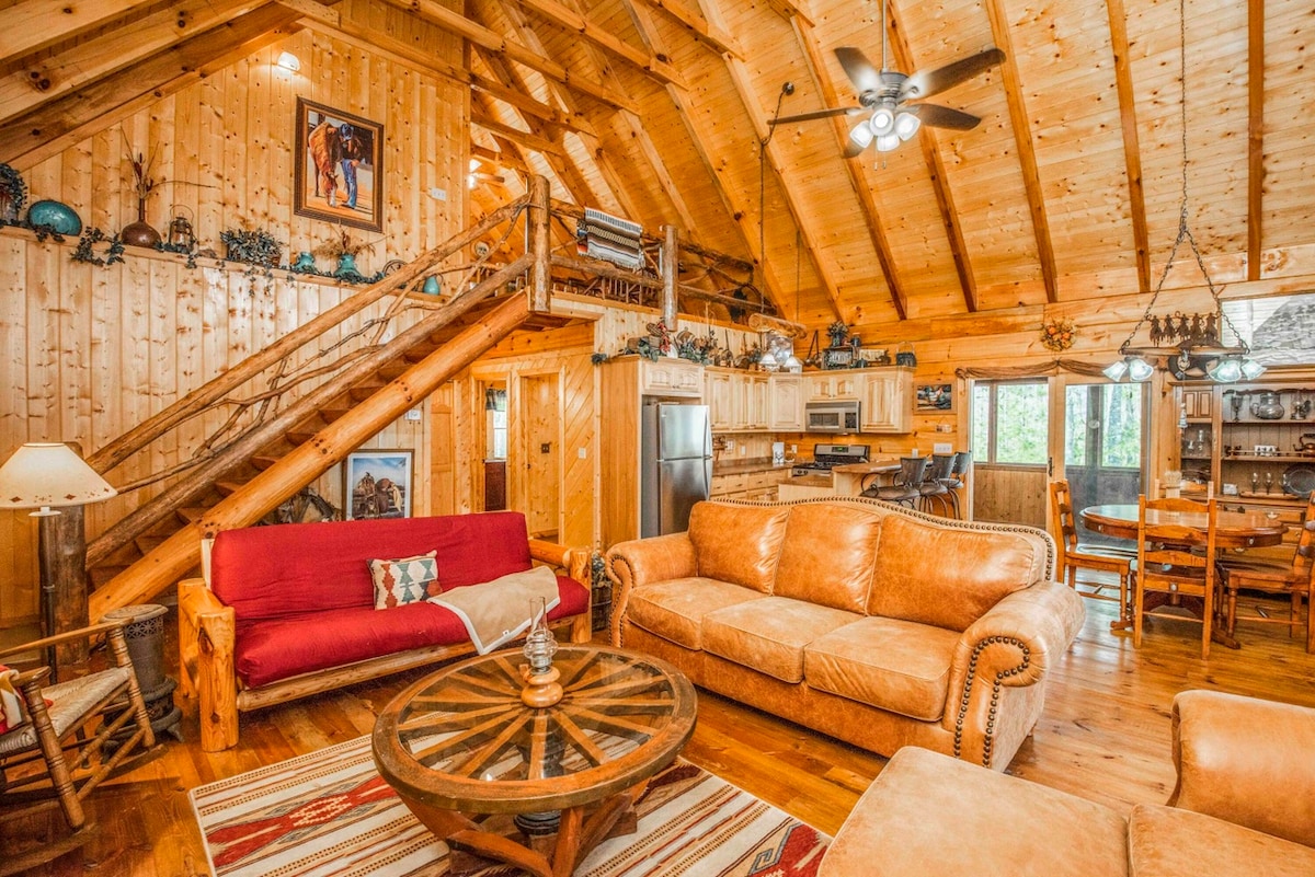 Magical 3-bedroom, 2-bath log cabin retreat on 9 secluded acres that actually BORDERS Big South Fork National Park. Direct access to horse/hiking trails...we also border trailhead! Equestrian Heaven, PET-FRIENDLY (2 pups max). Our spacious, well-lit, FREE 8-stall redwood barn/tack room plus large paddock are steps away from trailhead in sought-after, gated Wilderness Resorts. Close to Station Camp, Bandy Creek trails and 20 miles from Brimstone. Wifi, large-screen TV & games/books for downtime!