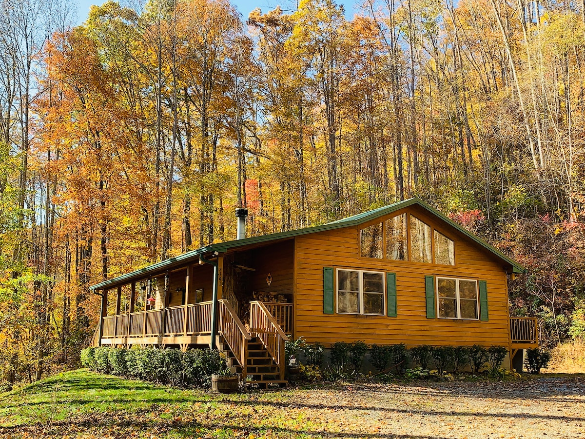 A perfect cabin getaway on a private mountain retreat w/2 bedrooms (king & queen beds), 2 baths, high ceilings, fireplace, and cozy outdoor fire-pit. Plenty of trails nearby - it's the charm you seek when visiting the Blue Ridge mountains & exploring Asheville, Maggie Valley, Blue Ridge Parkway, Great Smoky Mountains National Park, all within an hours drive. You can't help but be calm and relaxed once you arrive and sit in the rocking chairs on the front porch. Tranquility begins here!