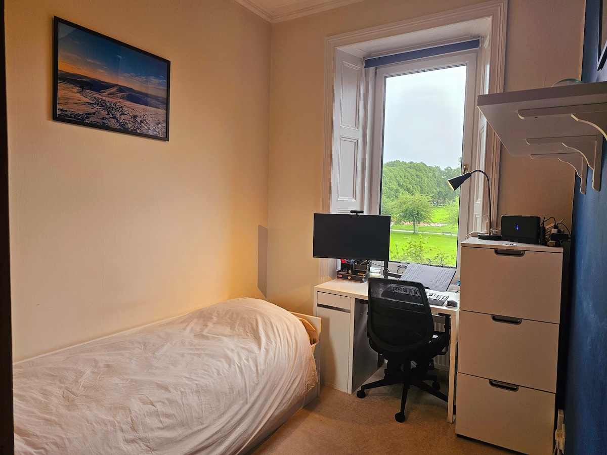 Experience Edinburgh by staying in one of her finest Victorian mansions with free on-site parking! Kingston House, adjacent to Liberton golf course, is situated in the leafy quiet district of Liberton. This home is absolute luxury; very quiet, spacious & peaceful. Large, double bedroom (super Kingsize bed) sleeps 2 & ensuite bathroom with bath & shower, wc, large living room with bay window, kitchen, wifi, GCH. All mod cons! 15mins to town by bus / driving.