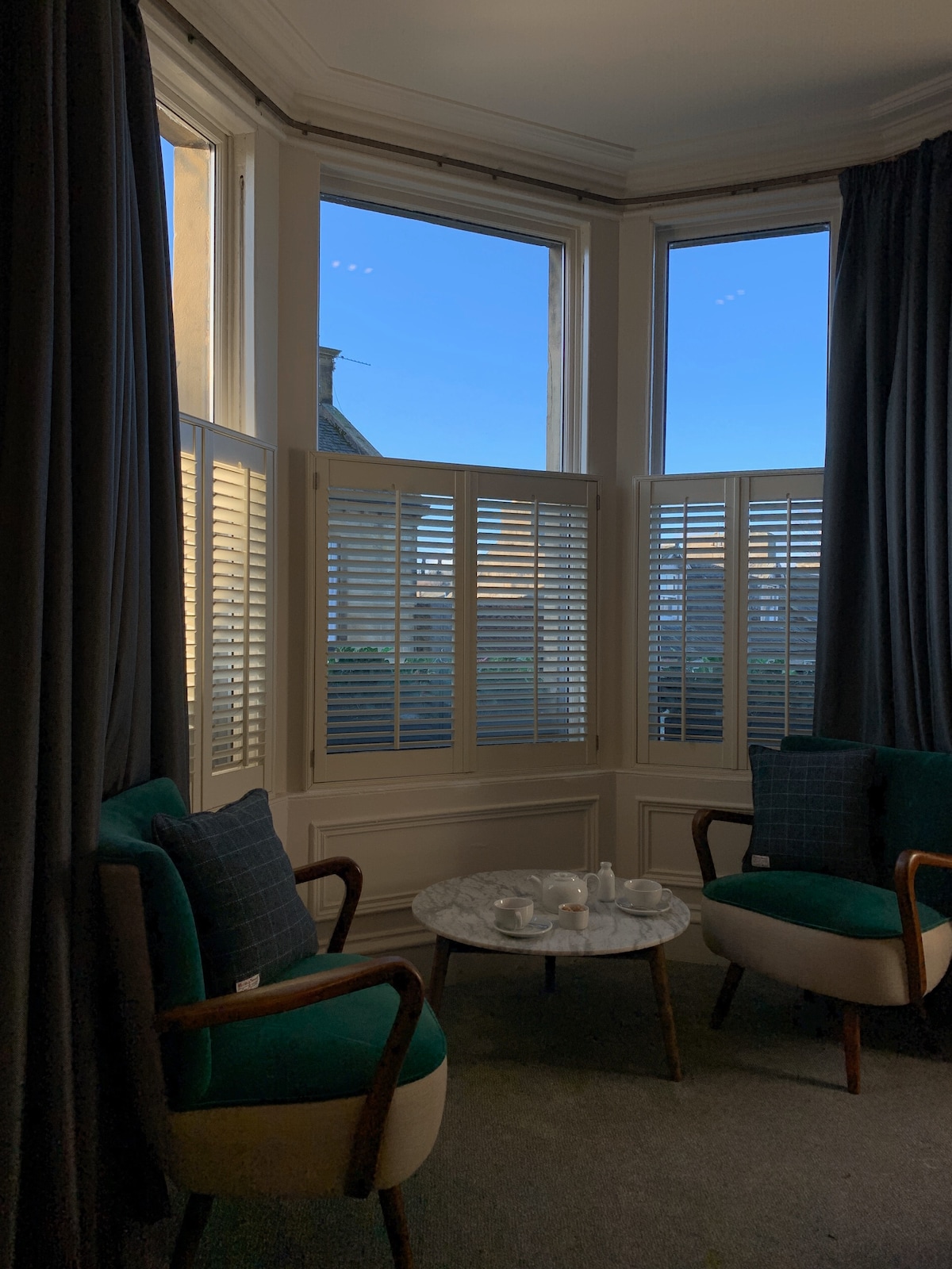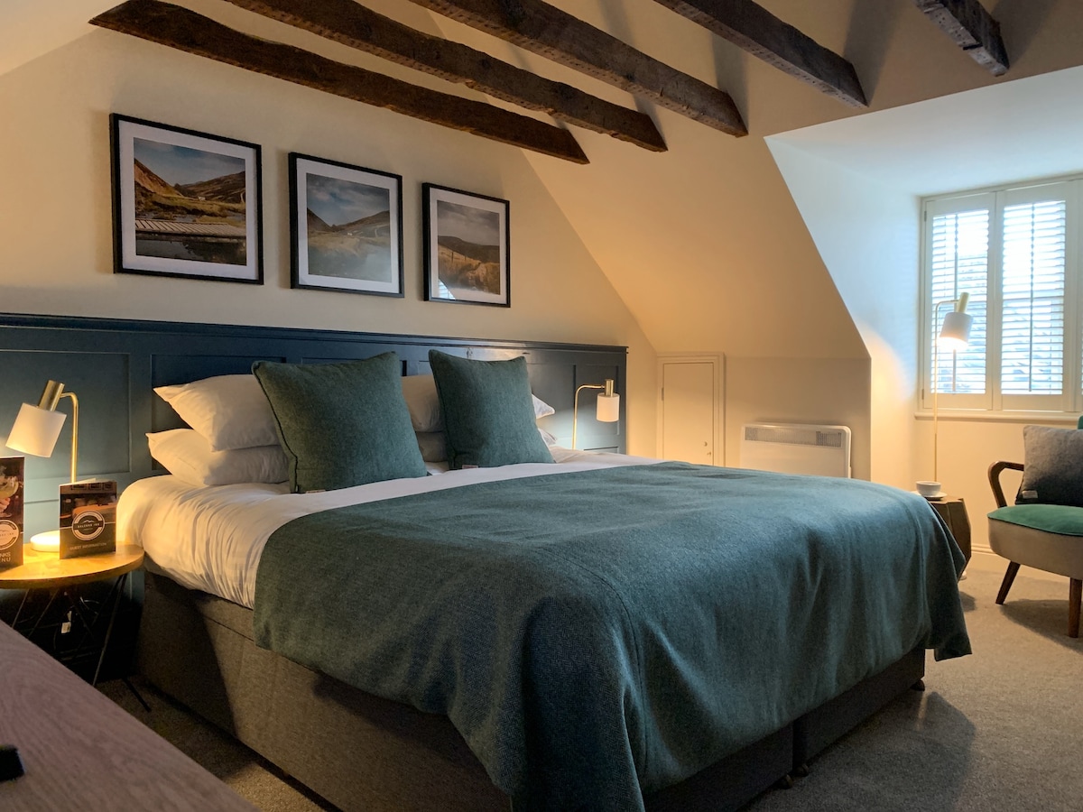 Accessed by 2 flights of stairs the Loganlea & Harlaw rooms are absolutely gorgeous and are both generously appointed. They feature vaulted ceilings with exposed original Victorian beams, refurbished picture window with views of the historic high street and abundant natural light. The rooms are warmly decorated room with stunning Harris tweed drapery. Carpets are deep pile and cosy underfoot. This rooms has the added advantage of being able to host an additional bed for a child so is perfect for a family getaway. The room features a desk, full length mirror, terrestrial digital tv and radio, kettle, individual tea and coffee. Also provided is a powerful hairdryer and ironing facilities are available from reception. The en-suite is perfectly appointed with wc, walk in shower enclosure, and sink unit with illuminated warmed mirror. We offer optional soft touch house keeping and all rooms include a free grab and go breakfast for consumption in your room.