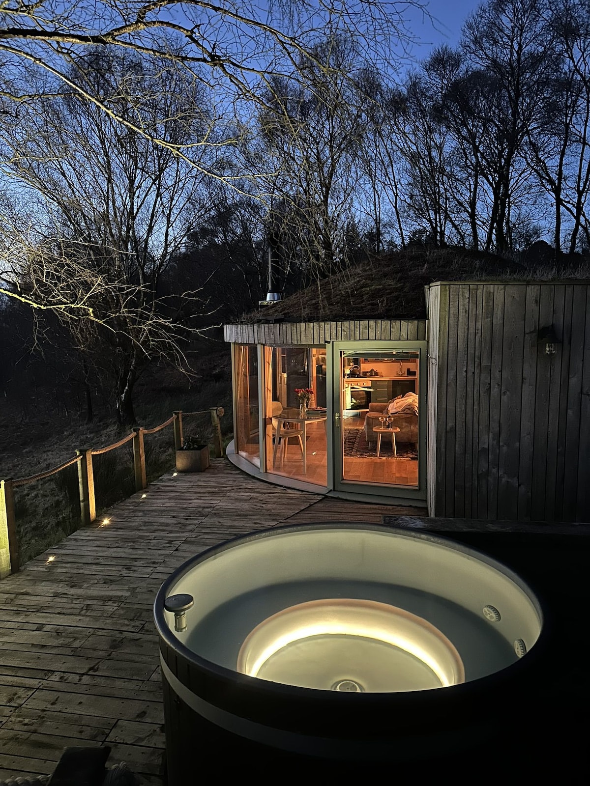 Welcome to The Captain’s Rest at FINGLEN! - Charming woodland path to your cabin (trolleys for luggage provided) - Hot outdoor double-ended bathtub - Outdoor firepits / indoor wood burning stoves - Large veranda with seating - King-size bed with luxury dressing gowns - Indoor bathroom featuring hot shower and eco composting toilet - Scenic views of wildflower meadows / river - Located near hiking trails and wild swimming spots - Eco Friendly! Solar powered, eco waterless toilet