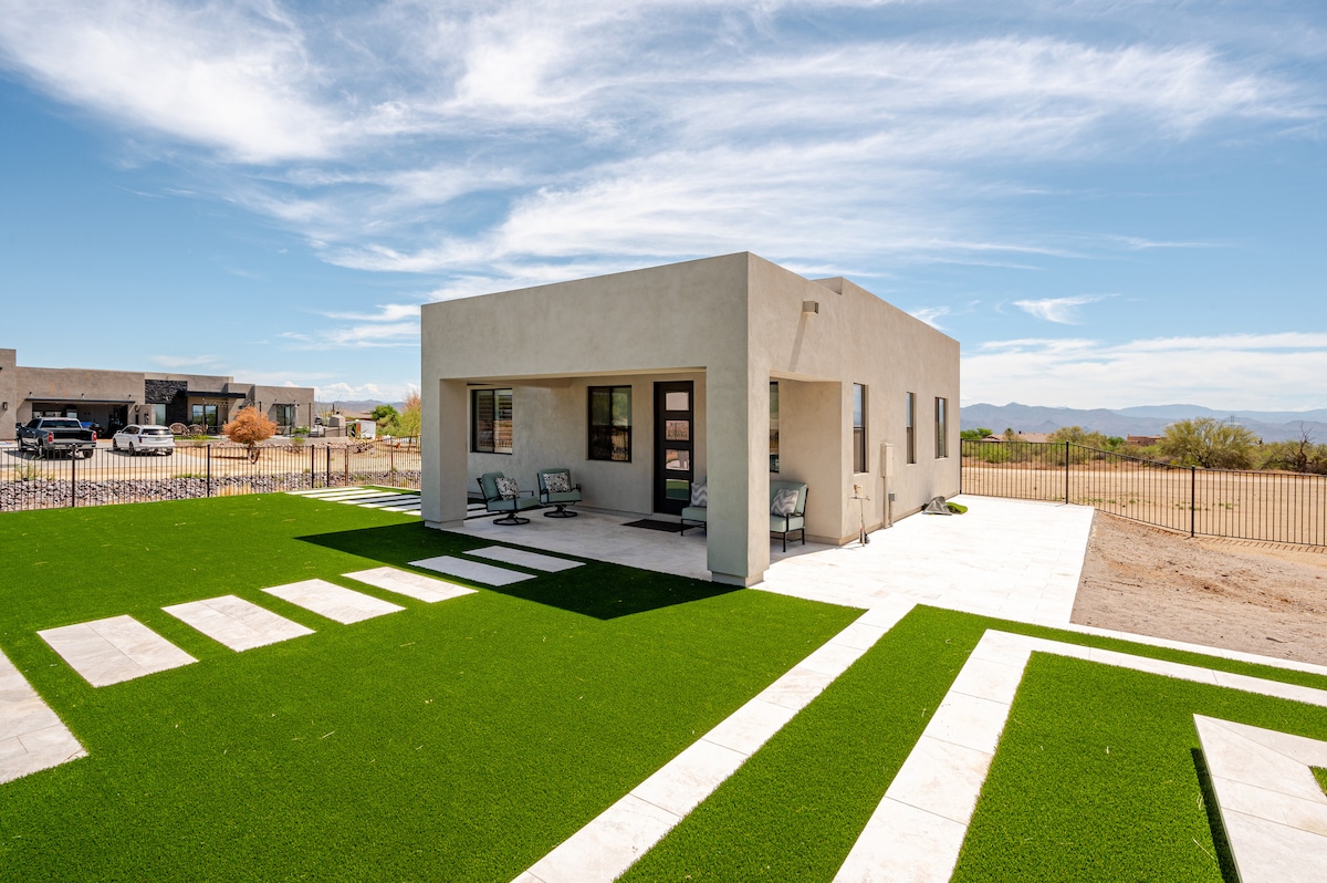 Kick back and relax in this calm, stylish space. Enjoy our newer Modern style casita with great views of the mountains. Located a little off the beaten in north east Scottsdale near several golf courses and nature trails. Plenty of parking including RV parking. Home includes 1 king bd, 1 queen bd, and queen sofa sleeper. 3 TVs including Directv, and apps. Guests are welcome to use on site amenities such as pool/spa and outdoor kitchen.