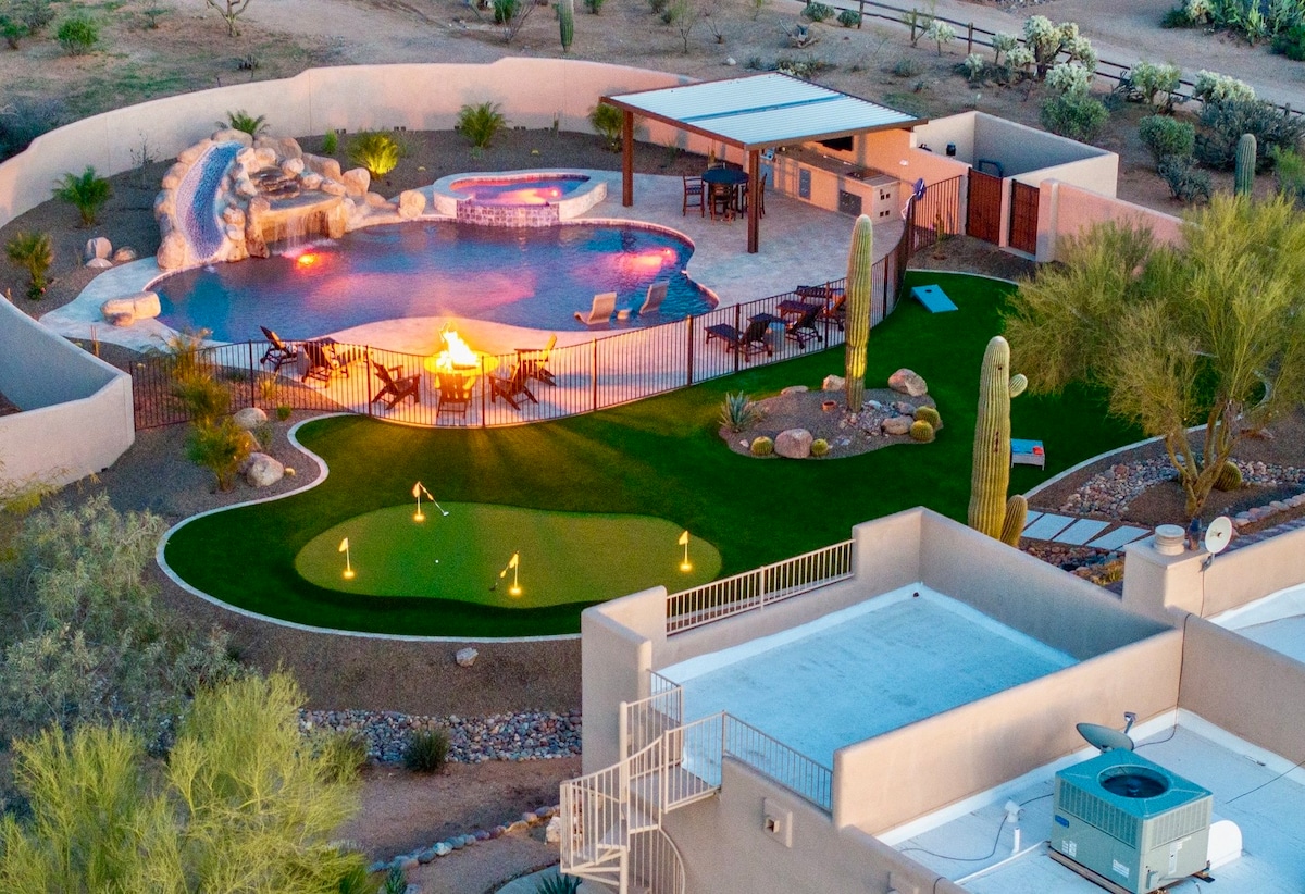 Enjoy all AZ has to offer in the 3 King Bed/4Private Bath home (2 Master suites)w/ Stunning backyard oasis including heated salt diving pool, Built in fire pit, mini golf, a poolside bath w/ double sinks, toilet, & 2 showers. Other features: covered patio with outdoor TV, waterfall, completely stocked w/ everything down to small appliances & cookware. Attention to detail in every corner of this gorgeous Scottsdale property! 10 minutes from Old Town, Airport and Tempe. License #2035374