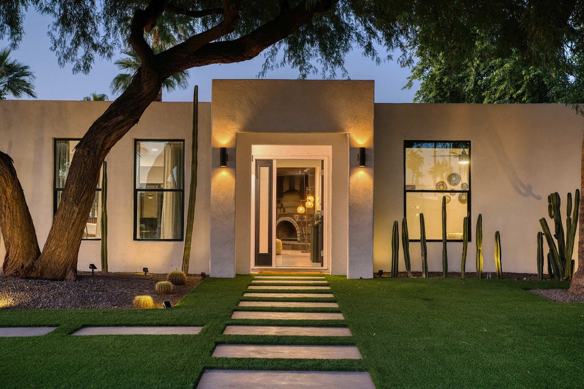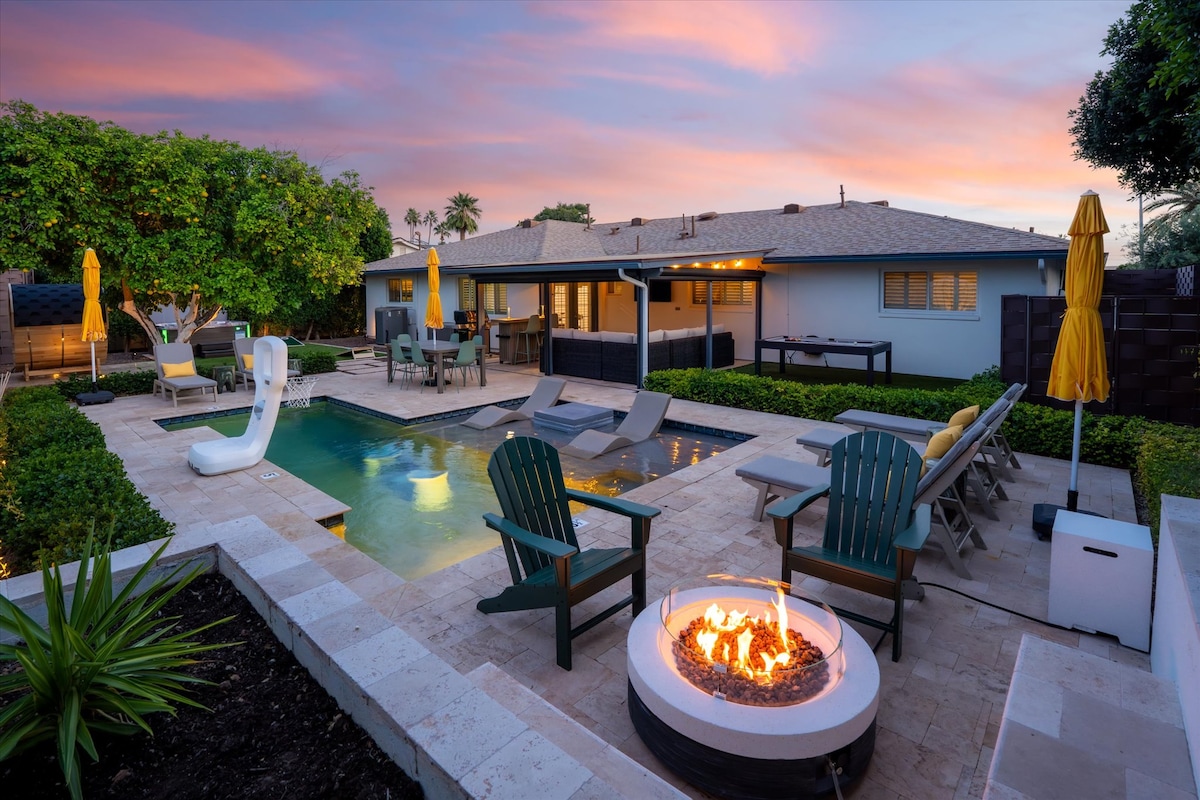 Welcome to The Hidden Hacienda Scottsdale! A fun, whimsical retreat with cowboy-chic decor, pool, spa, karaoke, and games—perfect for bachelorettes, families, or golf getaways. Sleeps 10 with comfy beds, smart TVs, a pool table and a fully stocked kitchen. Lounge beneath swaying palm trees, practice your swing on the mini putting green, or unwind in your private backyard oasis with cozy seating fire-pit and outdoor tv. Minutes to Kierland Commons, top golf courses, Spring Training and more!