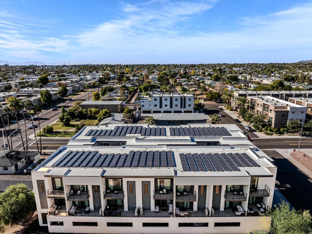 Walk to everything. Luxury, eco-friendly urban residence in lively downtown Scottsdale. 3-story, townhouse-style, nearly 2,000 SF of modern space, floor to ceiling windows, chef-inspired kitchen, private 1-bay garage, luxury toiletries, Nest thermostat, 3 patios. Surrounded by an eclectic mix of fine dining and luxury shopping. Located in one of the most desirable areas, across the W Hotel.