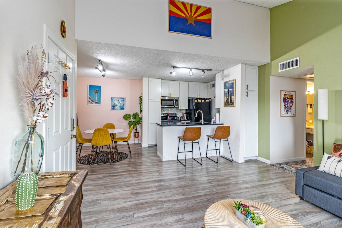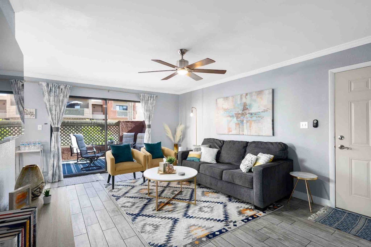 Experience the perfect blend of convenience and style in our 1BR/1BA condo, nestled in the heart of vibrant Old Town Scottsdale. ☀️KEY HIGHLIGHTS☀️ ▷ Heated pool and hot tub ▷ BBQ grill and & Fitness Center ▷ 15-20 minute walk to Old Town ▷ Parking space included ▷ Private balcony with shades ▷ NEW memory foam mattress. ▷ 15 min. drive to Camelback Mtn. ▷ Roku TV included ▷Laundry on-site ▷ Patio furniture ▷ Granite kitchen countertops We look forward to hosting you!