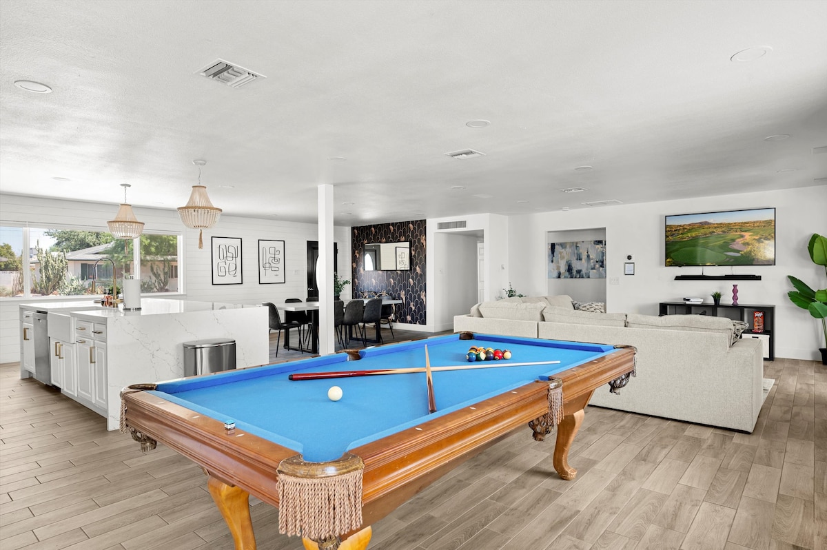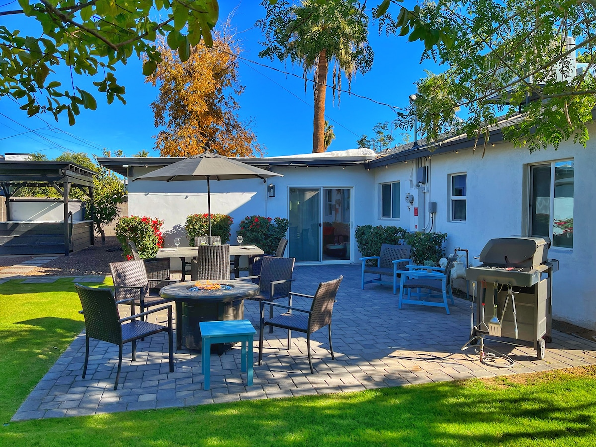 Newly remodeled beautiful single-level house in North Scottsdale, 2 minutes from highway 101, 3 miles from TPC&WestWorld, and 5 miles from Scottsdale Quarters and Kierland Commons shops and restaurants. 6 seats premium hot-tub, 9ft shuffleboard and foosball tables. Play basketball, soccer, pickle-ball in our basketball court in the large fenced backyard. Live TV channels, 250Mbps COX with 3 panoramic Wi-Fi. Washer/dryer, RV gate. Walking distance to Thunderbird Park playground and tennis courts.