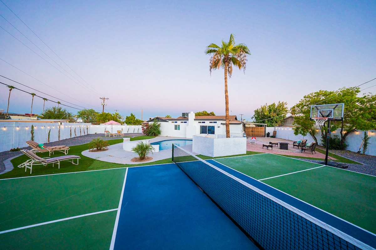 Revolution Retreat features a brand-new heated pool with travertine tile and turf backyard. The home was designed with an open floor plan and a unique style creating the perfect space for your vacation. It is located 3 miles from Old Town Scottsdale and 15 minutes from the airport, so you’re right in the middle of all of the valleys main attractions. The home sleeps up to 10 guests comfortably. (Please note that the pool can be heated for a fee, details below)