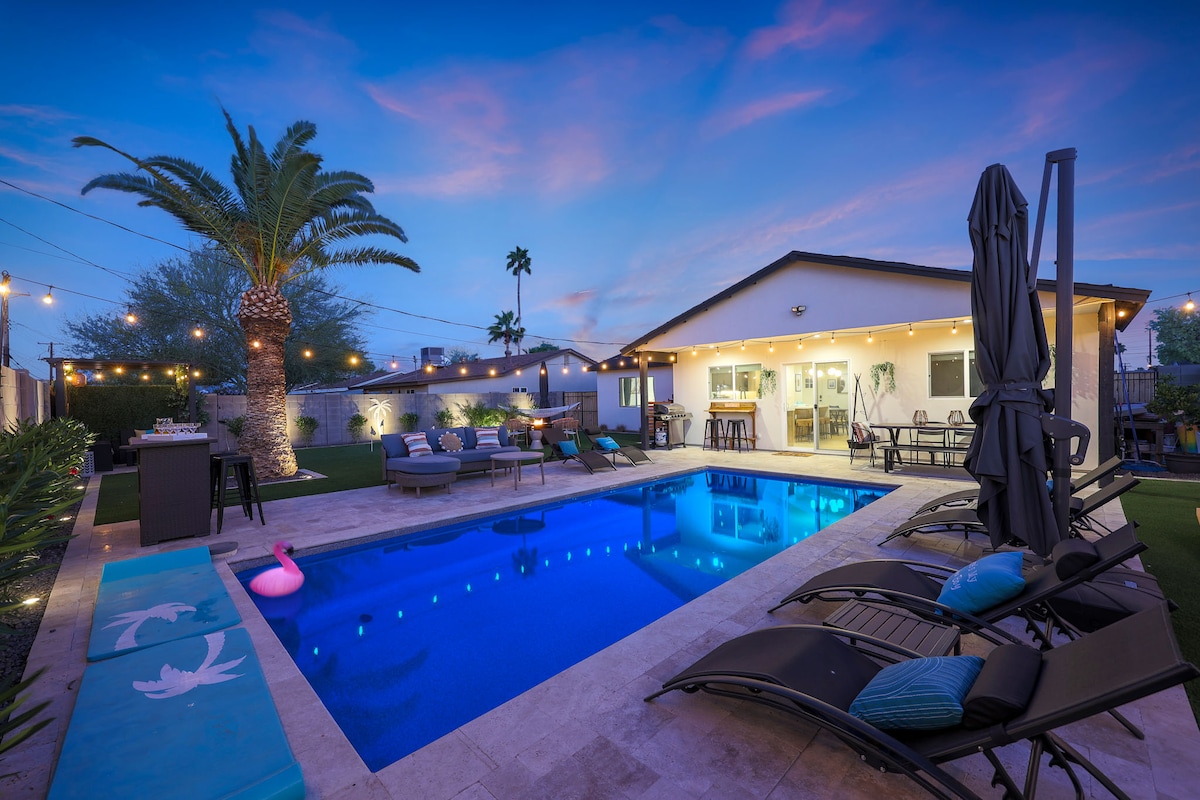 Agave Hideaways is a newly remodeled modern desert oasis, only minutes away from Old Town Scottsdale! This open floor plan is the perfect space for young adults or families to enjoy. Complete with a pool, fire pit, ping pong table, cornhole, outdoor bbq grill, and outdoor dining with tropical views of palm trees and mountains! This is the ultimate private retreat vibe, with picturesque spots around every corner! - POOL heated to 80 Degrees in Winter for FREE, $75 charge daily for higher temp